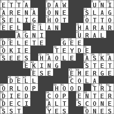 ACROSS 1. Singer James 5. Obsolete 8. Single; one (prefix) 11. Sports stadium 13. Single 14. Volcanic refuse 15. Former Milwaukee Brewers owner Bud 16. Being at a high temperature 17. "Beetle Bailey" pooch 18. Snakelike fish 19. Flair 21. Ethiopian city, capital of Harari 22. Hindu god of fire 24. Mountain range 25. Erase 27. Turn to the right 29. Migrant worker of the '30s 30. Miss Universe 1986, Barbara Palacios _ 32. Perceives with the eye 33. White Person, in Hawaii 35. "____ silly question..." 39. Supplementing with great effort 41. Proofreading order 42. Compass dir. 43. Develop 45. Small valley 48. Root beer relative 49. Fourth or lowest deck 50. Parka part 52. Three (prefix) 55. Passed on 56. Police officer (slang) 57. Keyboard key 59. Tenth: prefix 60. Keyboard modifier key 61. Biscuitlike quick bread 62. Fast jet (abbr.) 63. Affirmative reply 64. Washington bills DOWN 1. Comfort 2. Family _ (genealogy) 3. Copy Pinocchio 4. Cuckoo 5. Capital of the state of Qatar 6. At once, immediately (arch.) 7. Dripping 8. Extremist 9. Relating to or accompanying birth 10. Composer Stravinsky 12. Rep 14. Fly high 20. Untruth 21. Took on color 23. Honkers 25. Two (Sp.) 26. Supplement with great effort 27. Set 28. Sight organ 30. Coat; cloak 31. Artist's stand 33. Part of HMS, perhaps 34. A saturated hydrocarbon 36. Ski resort town in Vermont 37. Barrel 38. Had dinner 40. Seaweed 43. Environmental prefix 44. Methods 45. Frees from moisture 46. Choose 47. Farming town in central California 49. Likelihood 50. Hollow 51. Elects 53. French philosopher Descartes 54. Angers 56. Island 58. Non-commissioned officer (abbr.)