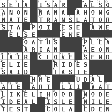 ACROSS 1. Bristle 5. Austrian river, tributary to the Danube 9. In addition 13. At once, immediately (arch.) 14. Grandmother 15. Amid 16. Nathan's nickname 17. Interpreter 19. R.R. building 20. Luau course 21. Compass dir. 22. Deep reverence 23. Otherwise 25. She-sheep 26. Expletives 30. Entreaty 34. Believer in; advocate of (suffix) 35. A really long time 36. Den 39. Garlic unit 42. Post 43. Writer Wiesel 44. Amusement-park features 46. Expressed in words 47. Clothes sense 48. Madame (abbr.) 51. Freehold land 54. Had dinner 57. Tate display 58. Cards in a Roman deck? 60. Large container 62. Odds 65. Thickened enlargement 66. Standard of perfection 67. Small island 68. The longest river in the world 69. Trial 70. Root beer relative 71. Genesis locale DOWN 1. Without 2. Maternal 3. Add up to 4. A saturated hydrocarbon 5. To the inside or interior of 6. Indian skirt 7. Santa ___, CA 8. Indian princess (variant) 9. Housemaid (var.) 10. Globular water bottle used in Asia 11. Frozen precipitation 12. Legendary monster 15. Toward shelter 18. Compass dir. 20. Lightbulb-shaped fruit 24. Flew 27. Nervous spasm 28. Actor Linden 29. Derisive sound 30. Went by 31. Area sheltered from the wind 32. Period of immesurable duration 33. Added to 36. French article 37. In the manner of 38. One more than two 40. By way of 41. Begley and Asner 45. Needle case 48. Promenade 49. Medical imaging device (abbr.) 50. Principle of right and wrong 52. Shun 53. Dipping utensil 54. Set down 55. Periodic rise and fall of the sea level 56. Supplements with great effort 58. Hang loosely or laxly 59. The content of cognition 61. Adolescent 63. Erode 64. Bear (Spanish) 65. Compass dir.