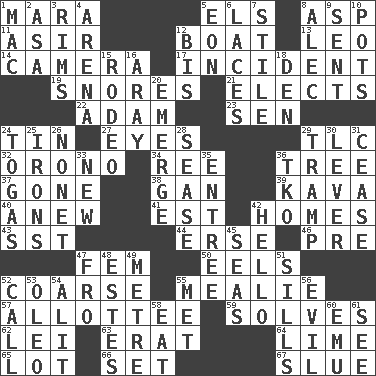 ACROSS 1. Hindu Mythology: god of death 5. Raised railways 8. Cleo's killer 11. SW Saudi Arabia district 12. Water vessel 13. Lion 14. Device for capturing images 17. Event 19. Sounds asleep 21. Opts 22. First man 23. Elected rep. 24. Shallow baking pan 27. Sight organs 29. Affectionate concern, for short 32. U. of Maine site 34. To riddle 36. Woody plant 37. Went 38. Separate the seeds from cotton 39. Polynesian shrub of the pepper family 40. Afresh 41. Eastern Standard Time (abbr.) 42. Dwellings 43. Fast jet (abbr.) 44. Celtic language 46. Before (prefix) 47. Opposite of masc. 50. Snakelike fish 52. Unrefined 55. Ear of corn 57. One to whom something is allotted 59. Finds the solution 62. Luau accessory 63. Part of Q.E.F. 64. Welles in "The Third Man" 65. Car dealer's back yard 66. Arrange properly for use 67. Change direction abruptly DOWN 1. Big _ 2. White ___ sheet 3. Basketball hoops 4. Sports stadium 5. A really long time 6. Shoestrings 7. Vertical member of a panel or frame 8. Actor Baldwin 9. Emitted 10. Cooking vessels 12. Altar cloth linen 15. Cowboy competition 16. Like ___ of sunshine 18. Lair 20. Develop 24. Ancient Roman robes 25. Metal shackles 26. Music written for nine 28. Gospel singer Marvin 29. _____ steamer (cargo ship) 30. Crowbar 31. Desist 33. ___ Haven, CT 35. Main course 36. Ring climax 42. Phone greeting 45. Oceans 47. Back 48. _____ Park, CO 49. Distance measurement (Brit.) 51. Beverly of Met fame 52. Give a ring to 53. Butter sub 54. Came down and settled, as after flight 55. Was introduced to 56. Tending to cause great harm 58. Ingest 60. Australian flightless bird 61. Observe