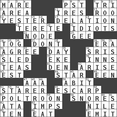 ACROSS 1. Female horse 5. Pacific Standard Time (abbr.) 8. Three (prefix) 11. Type of rug 12. Angers 13. Friend of Pooh 14. Last past 17. Accusation by an informer 19. Cylindrical with tapered ends 21. Foolish or stupid persons 22. Thickened enlargement 23. Unit of force equal to gravity 24. Coat; cloak 27. Do not 29. Period 32. Match 34. 24 hours 36. Indian titles of respect 37. Downhill vehicle 38. Make supply last 39. Taverns 40. Beverages made from leaves 41. Lair 42. Ascend 43. Eastern Standard Time (abbr.) 44. Play the lead 46. Car or cant ending 47. Auto club (abbr.) 50. "This won't hurt ____!" 52. A viewer who gazes fixedly 55. Fortification 57. Coward 59. Sounds asleep 62. _ moment's notice (2 wds.) 63. Naughty children 64. The longest river in the world 65. Nine, plus one 66. Ingest 67. Give off DOWN 1. Fifth month 2. "We ___ not amused" (Victoria) 3. Remainder 4. Eroded 5. Before (prefix) 6. Major League Baseball Commissioner Bud 7. Sadhe (variant) 8. Musical group of three 9. Carrot, for example 10. Charged atoms 12. Binary compound 15. Eat (away) 16. Make new 18. Neckwear 20. Looked after 24. Clothes sense 25. Stares at amorously 26. Relatively large 28. Receives possession of 29. Bert's buddy 30. Remove soap 31. NE Netherlands city 33. Begley and Asner 35. Gossips 36. Title for a knight 42. Believer in; advocate of (suffix) 45. Lettered men learn these first 47. Tate display 48. Nest on high 49. Odor 51. Marketplace scale 52. Argument over a trivial matter 53. Haul 54. ____ Jay Lerner 55. Followers of ems 56. Demure 58. Choose 60. Biblical high priest 61. Put into a specified state
