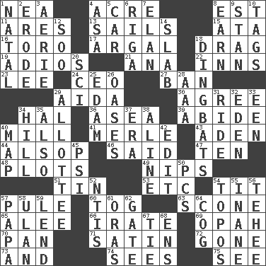 ACROSS 1. Teachers' org. 4. Land measure 8. Eastern Standard Time (abbr.) 11. Ancient Greek god of war 13. Travel by water 15. "One Day ___ Time" 16. "Corrida" creature 17. Therefore, facetiously 18. To trail on the ground 19. Goodbye (Sp.) 21. Santa ___, CA 22. Lodging establishments 23. Area sheltered from the wind 24. Corporate head (abbr.) 27. Forbid 29. Opera by Verdi 30. Match 34. Actor Linden 36. Toward the sea 39. Remain 40. Place where flour is made 41. Haggard of country music 43. Arabian gulf 44. Columnist Joseph or Stewart 46. Stated 47. Nine, plus one 48. Small pieces of grounds 49. Pinches, bites 51. Metal container 53. And so on (abbr.) 54. Teat (slang) 57. Whine 60. Coat; cloak 63. Biscuitlike quick bread 65. Toward shelter 66. Feeling or showing extreme anger 69. Brightly colored fish 70. Baking dish 71. Smooth fabric 72. Went 73. Added to 74. Observes 75. Perceive with the eye DOWN 1. Brizilian seaport 2. Eat (away) 3. Nest on high 4. White ___ sheet 5. Automobile 6. Capital of Latvia 7. Liveliness 8. Merit 9. Comedian Laurel of Laurel & Hardy 10. Labels 12. "Barney Miller" actor Jack 14. Thick slice 18. Empty-headed or silly people 20. _-fi 25. Dutch treat 26. Fertile tracts in a desert 28. Auto club (abbr.) 29. One to whom something is allotted 31. Travel on or in a vehicle 32. Locale of original sin 33. Car or cant ending 34. Land elevation 35. In addition 37. Period 38. Place in a line 40. Atlas unit 42. Prepare for publication 45. Air pressure measure (abbr.) 50. Personal Computers (abbr.) 52. Nuclear Threat Initiatives 54. Traditional theme or motif 55. Empty; void 56. Giggle 57. Dad 58. ____ Bator, Mongolia 59. Grant temporary use of 61. Mouths or openings 62. Yard entry 64. Gear tooth 67. Standoff 68. Followers of ems