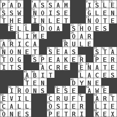 ACROSS 1. Groovy apt. 4. Indian state 9. Small island 13. Compass dir. 14. Annoying sound 15. Small, secluded valley 16. Definite Article 17. An arm off of a larger body of water 18. Observe 19. Pipe bend 21. ___ good deed 22. Imelda's hoard 24. Welles in "The Third Man" 26. Rowing implement 27. N. Chile seaport 29. Governing power 30. Music written for nine 31. Oceans 33. R.R. building 36. Coat; cloak 37. Orator 40. For each 41. It is 42. 43,560 square feet 43. Maternal 45. "This won't hurt ____!" 47. Shoestrings 48. Nine, plus one 49. Unit of force 50. Removes the wrinkles 52. Compass dir. 54. Deep reverence 56. Tending to cause great harm 57. An unpleasant substance 59. Tate display 61. Give a ring to 62. Flexible twig of a willow tree 63. Falsehood 64. Singles 65. _ dish (used to culture cells) 66. A weed DOWN 1. Pacific Standard Time (abbr.) 2. American tennis player Robert 3. Residences 4. Black tropical American cuckoo 5. Message 6. Grain storage tower 7. At sea 8. Was introduced to 9. Dismiss 10. _ gin 11. Allows 12. Compass dir. 20. Louse (plural) 22. Boozer 23. Actor Linden 25. Floor protectors 27. Against 28. Carrot, for example 29. Immoral or dissolute person 31. Religious group 32. Hearing organ 33. High altitude stroll 34. Wig 35. Ancient Greek god of war 38. Aches 39. Have trust in 44. Grandmother 45. Ringlike coral islands and reefs 46. Benjamin's nick name 49. Put off 50. _ the terrible 51. Cause heat under the collar 52. Celtic language 53. Set or collection 55. 4th largest of the Great Lakes 56. Environmental prefix 57. Police officer (slang) 58. Three (prefix) 60. John Ritter's dad