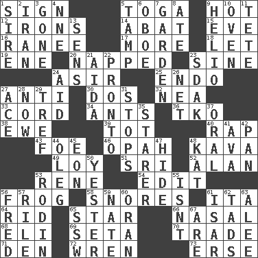ACROSS 1. Omen 5. Ancient Roman robe 9. Being at a high temperature 12. Metal shackles 14. Blind as ____ 15. First lady 16. Indian princess (variant) 17. Greater amount 18. Allow 19. Compass dir. 20. Slept 23. Trig term 24. SW Saudi Arabia district 25. Inside; within (prefix) 27. Against 30. Two (Sp.) 32. Teachers' org. 33. Drawstring 34. Pismires 36. Ring climax 38. She-sheep 39. Small child 40. Strike 43. Enemy 46. Brightly colored fish 48. Polynesian shrub of the pepper family 49. Myrna of the movies 51. _ Lanka 52. ____ Jay Lerner 53. French philosopher Descartes 54. Prepare for publication 56. Tree-dwelling hopper 58. Sounds asleep 61. Call ___ day 64. To free from 65. Play the lead 66. Rhinal 68. Connecticut Ivy Leaguer 69. Stalk of a moss capsule 70. Swap 71. Lair 72. Songbird 73. Celtic language DOWN 1. Male parent of an animal 2. SW Asia republic 3. Went 4. Compass dir. 5. Pack (down) 6. Mitch Miller's instrument 7. Place where plants grow 8. Had dinner 9. Sun: prefix 10. Baking chamber 11. False hair 13. Elected reps. 21. Opera by Verdi 22. Right away 23. Neighbor of Neb. 24. Assist 26. Fish or hair follower 27. Adept person 28. At this time 29. Not kosher 31. Ceases 35. A viewer who gazes fixedly 37. Spoken 41. Actress Gardner 42. Baking dish 44. Cassini of fashion 45. Age 47. Flintstone garb 48. Krazy ___ of comics 50. Last past 53. "The Thinker" sculptor 55. Is not 56. Flintstone 57. Cause heat under the collar 59. Nathan's nickname 60. Northwest Algerian city 61. Austrian river, tributary to the Danube 62. Small boys 63. Toward shelter 65. Compass dir. 67. "We ___ not amused" (Victoria)