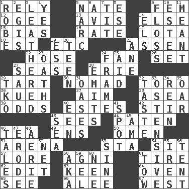 ACROSS 1. Have trust in 5. Nathan's nickname 9. Opposite of masc. 12. Double curve, resembling the letter S 13. Opinion 14. Otherwise 15. Prejudice 16. Assign a rank or rating to 17. Globular water bottle used in Asia 18. Eastern Standard Time (abbr.) 19. And so on (abbr.) 21. NE Netherlands city 22. Flexible conduit 24. Avid follower 26. Put into a specified state 27. Gospel singer Marvin 28. 4th largest of the Great Lakes 29. Small pie 30. Wanderer 32. "Corrida" creature 36. Malaysian steamed pastry 37. Direct toward a target or goal 38. At sea 39. Likelihood 40. _____ Park, CO 42. Agitate 43. Observes 44. Eucharist need 46. Afternoon social gathering 49. Followers of ems 50. Sign of things to come 51. Sports stadium 53. R.R. building 54. Be seated 57. Old wives' tales, e.g. 58. Hindu god of fire 61. Become fatigued 62. Prepare for publication 63. Peachy ____! 64. Baking chamber 65. Perceive with the eye 66. Toward shelter 67. 270 degrees DOWN 1. Loose flowing garment 2. Armor plate that protects the chest 3. Tough but pliablecoriaceous 4. Consenting reply 5. Drug cop 6. Actress Gardner 7. Teat (slang) 8. Compass dir. 9. Soft thread for cleaning between teeth 10. First name in cosmetics 11. Intended 14. Raised railways 19. Double-curved letter 20. Adolescent 21. A saturated hydrocarbon 23. Curses 24. Movie unit 25. Help 27. Saudi Arabian king (1953-1964) 28. Sends forth 29. Ring climax 31. Fertile tracts in a desert 32. Clothes sense 33. Clearly or manifestly demonstrative 34. It's straight from the horse's mouth 35. Boat paddle 40. Car or cant ending 41. Blemish 43. Ocean 45. Housemaid (var.) 46. Stories 47. Eat (away) 48. Nest on high 52. Fish or hair follower 53. Trig term 55. Angers 56. Portable shelter 58. Alias (abbr.) 59. Set 60. Born 61. Pull behind