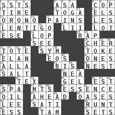 ACROSS 1. Fast planes 5. White ___ sheet 8. Police officer (slang) 11. Hoop that covers a wheel 12. Ancient Roman robe 14. Raised railways 15. U. of Maine site 17. Aches 18. French article 19. Small, flat, pigmented spot on the skin 21. Cards in a Roman deck? 22. Car dealer's back yard 23. Compass dir. 24. Trim (branches) 25. Hit sharply and swiftly 27. Observe 28. "Mermaids" star 31. Lug 35. Symbol (abbr.) 37. Puff or smoke 38. Liveliness 39. Greek goddess of the dawn 41. Singles 42. Silent film actress Nazimova 43. Again 45. Egg locale 46. Table seasoning 47. Teachers' org. 49. John Ritter's dad 51. Set 52. Eastern Standard Time (abbr.) 55. Health resort 57. Mountains (abbr.) 60. Substance 62. Petroleum 63. Toward the future 65. Fertile tracts in a desert 66. Area sheltered from the wind 67. Suttee (variant) 68. The smallest animal of a litter 69. Double-curved letter 70. Scottish cap 71. Puts into a specified state DOWN 1. Fur scarf 2. Begets 3. Marketplace scale 4. Emitted 5. _ moment's notice (2 wds.) 6. Earth 7. Hindu god of fire 8. Portable communications device 9. Margarine 10. Inconspicuous attention getter 13. SW Saudi Arabia district 16. Petroleums 17. Wimpy's pal 20. Moves 26. 13-14th century defensive garment 29. Makes supply last 30. Repose 31. Afternoon social gatherings 32. Spanish pot 33. Baron Munchausen's specialties 34. Related on the mother's side 36. Crowd into 40. Scorched 44. Perceives with the eye 48. In addition 50. Dec. holiday 52. Take place subsequently 53. Odor 54. Trials 55. Flatfish 56. Sliced desserts 58. Not this but _ 59. Stalk of a moss capsule 61. Hearing organs 64. Direct toward a target or goal