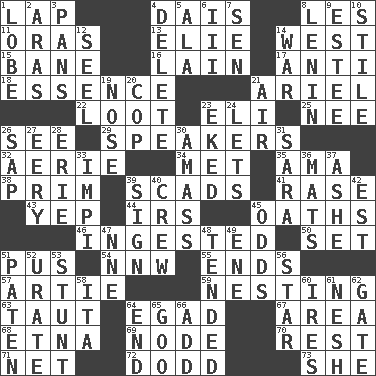 ACROSS 1. Pet locale 4. Raised platform 8. French article 11. Mouths or openings 13. Writer Wiesel 14. Compass direction 15. Object of repulsion 16. (Had) reclined 17. Against 18. Gist 21. Satellite of Uranus 22. Plunder 23. Connecticut Ivy Leaguer 25. Born 26. Observe 29. Orators 32. Nest on high 34. Was introduced to 35. Nanny (var.) 38. Demure 39. Large numbers or amounts 41. Raze (variant) 43. Slangy assent 44. Big collection agency 45. Expletives 46. Swallowed 50. Put into a specified state 51. Ichor 54. Compass dir. 55. Conclusions 57. Nick name for Arthur 59. Snuggling 63. Pulled tight 64. Mild oath 67. Type of rug 68. Inactive volcano in Sicily 69. Thickened enlargement 70. Remainder 71. Fish or hair follower 72. Texas town _ City 73. A female animal or person DOWN 1. Ear part 2. Ancient river in northeast Turkey 3. Baking dishes 4. Keyboard key 5. Chicken ___ king 6. One more than two 7. Elected rep. 8. Soviet premier 1918-24 9. First name in cosmetics 10. Vertical member of a panel or frame 12. Stitch closed the eyes of (a falcon) 14. Armed conflict 19. Olfactory organ 20. Police officer (slang) 21. Atmosphere 23. Supplemented with great effort 24. Allows 26. Plant excrement 27. Suggestive of the supernatural 28. One of the Great Lakes 30. Collect or gather 31. "Two Mules for Sister ____" 33. Body of Kaffir warriors 36. Floor protectors 37. American tennis player Robert 39. Omen 40. Ship's personnel 42. Eastern Standard Time (abbr.) 45. Probability 47. Compass dir. 48. Looked after 49. Compass dir. 51. Eucharist need 52. A salt of uric acid 53. Check the growth or development of 56. Play the lead 58. Call ___ day 60. Angers 61. Delicate 62. Yard entry 64. Conclusion 65. Thick or sticky substance 66. Find the sum of