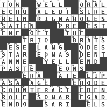 ACROSS 1. Pull behind 4. Water source 8. Relating to the mouth 12. Shade of tan 14. Eskimo relative 16. Male parent of an animal 17. It's straight from the horse's mouth 18. Complicated, petty procedures 20. Smooth fabric 22. Before (prefix) 23. Eastern Standard Time (abbr.) 24. Compass dir. 25. Often (poetically) 28. Third day of the wk. 30. Musical group of three 31. Naughty children 35. Compass dir. 37. Long (Scottish) 40. Lyric poems 41. Play the lead 42. Ferber et al. 44. Incision 45. Singer Murray 46. Shout 47. Conclude 48. Thick mixture 50. Immeasurably long periods of time 52. Period 54. Had dinner 55. Mouth edge 58. White ___ sheet 61. Personal question 63. Eat (away) 65. Neutralize 70. Paradise 71. Hero or heavy, e.g. 72. Echolocation 73. Mild oath 74. Inside; within (prefix) 75. Indian skirt 76. Raised railways DOWN 1. Laconic 2. Sea 3. Compose 4. Armed conflict 5. Connecticut Ivy Leaguer 6. Part of a journey 7. Mass 8. Bear (Spanish) 9. Cause heat under the collar 10. Ancient Greek god of war 11. For fear that 13. University (slang) 15. Small pie 19. Reuben's nickname 21. And not 26. Do some clerical work 27. Sycophant 29. Eats (away) 30. Cylindrical with tapered ends 32. An important port of Yemen 33. Look after 34. Fast jet (abbr.) 35. Inactive volcano in Sicily 36. Without 38. Compass dir. 39. An organ shaped like a helmet 41. Plant excrement 43. Slit 49. Part of Q.E.F. 51. Born 53. Eons 55. Inn 56. Standard of perfection 57. Hangs 58. Land measure 59. Within a short period 60. Old (Scot.) 62. Greek god of love 64. To sift 66. Modern: prefix 67. Santa ___, CA 68. Auto 69. Three (prefix)