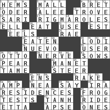 ACROSS 1. Equivocates 5. Shopping center 9. Cy Young winner Saberhagen 13. River in Europe 14. Toward shelter 15. Collection of objects 16. Indian skirt 17. Frustrating wastes of time 19. Pipe bend 20. Erode 21. Purpose 22. Eastern Standard Time (abbr.) 23. Snakelike fish 25. Actress Charlotte 26. Eroded 30. Farming town in central California 34. New (sp.) 35. One who makes use of a thing 36. Von Bismarck 39. Effrontery 42. Sty mamas 43. Lightbulb-shaped fruit 44. French painter Edouard 46. Docile 47. Navigate 48. Followers of ems 51. Libertine 54. Electrical Unit 57. Teachers' org. 58. Declare 60. Lyricist Gershwin 62. Dwellings 65. Toadlike animal 66. Trials 67. Hyperbolic tangent 68. Travel on or in a vehicle 69. Singer James 70. Domed church section 71. Singles DOWN 1. Flexible conduit 2. Peak District village in England 3. Haggard of country music 4. Indian title of respect (Mr.) 5. Hindu Mythology: god of death 6. Came down and settled, as after flight 7. Part of a journey 8. Arboreal primate 9. Sis' sibling 10. Hero or heavy, e.g. 11. Nights before holidays 12. Trial 15. Family _ (genealogy) 18. White ___ sheet 20. Son of Isaac 24. Poe poem 27. Nine, plus one 28. Night before a holiday 29. Typical models 30. A period of five years 31. Bear (Spanish) 32. Morning condensation 33. Big collection agency 36. Choose 37. Beverage made from leaves 38. Scottish cap 40. Large container 41. Compass dir. 45. Suggestive of the supernatural 48. Extremities 49. Born 50. Before Barbara or Clara 52. Japanese brewing company 53. Wear away 54. Johnson of "Laugh-In" 55. Confront 56. Inconspicuous attention getter 58. Elected reps. 59. American tennis player Robert 61. Matures 63. Call ___ day 64. Head covering 65. Back