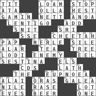 ACROSS 1. Teat (slang) 4. Rich soil 8. Close up, plug up 12. "One Day ___ Time" 13. Spanish pot 14. Behest 15. Street urchin 18. Remaining after all deductions 19. Small Philippine buffalo 20. Small, flat, pigmented spot on the skin 22. Increase 23. In a ____ (agitated or irritated) 24. _ Lanka 25. Compass dir. 26. Leopard's kin 30. Infant food 33. Haggard of country music 36. Drop; flow; fall 37. Having or resembling wings 39. Afternoon social gathering 40. Family _ (genealogy) 41. Farming town in central California 42. Foe 44. Snakelike fish 45. French poetic form 47. Raised railways 50. Music discs 51. Thin strip of wood or metal 53. Definite Article 54. Normal relaxed breathing 57. Jai _ 59. Mouths or openings 61. An organ shaped like a helmet 63. Mediterranean tributary 64. Raze (variant) 65. Car dealer's back yard 66. Nights before holidays 67. Fermented drink made from hops 68. Single DOWN 1. Label 2. Slanted text style (abbr.) 3. Domesticates 4. Having great length 5. Butter sub 6. Keyboard modifier key 7. Floor covering 8. Most dark, concealed or hidden 9. Look after 10. Bear (Spanish) 11. Parent Teacher Association (abbr.) 16. Lodging establishments 17. Nuclear Threat Initiatives 21. A whole individual unit 22. "We ___ not amused" (Victoria) 24. A female animal or person 26. Burrowing marine mollusk 27. Hoop that covers a wheel 28. Toward shelter 29. The bottom of a shoe or boot 30. Friends 31. Medicinal plant 32. Writing tablets 34. Inactive volcano in Sicily 35. To separate or throw off 38. Actors Guy, Robert Welles, and Clint 42. Followers of ems 43. Sharp bark 46. Binary compound 48. Long (Scottish) 49. Portico 52. Phone greeting 53. Story 54. Relaxation 55. One who uses or employs something 56. Age 57. One (Scot) 58. 54 in ancient Rome 59. Globe 60. Actress Charlotte 62. Had dinner
