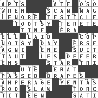 ACROSS 1. Flats, for short 5. Had dinner 8. Bear (Spanish) 11. Songbird 12. Skim 13. Tired old horse 14. Poe poem 17. A testis 19. A girl or young woman (variant) 21. Cylindrical with tapered ends 22. Prong on a fork 23. Epoch 24. Pipe bend 27. Put down 29. Police officer (slang) 32. Annoyingly loud 34. 24 hours 36. Celtic language 37. Hindu god of fire 38. Compass dir. 39. Costume for a special activity 40. Drawn tight 41. French article 42. Put off 43. Followers of ems 44. Play the lead 46. Three (prefix) 47. Shoshoni 50. Part of Q.E.F. 52. Went by 55. Window treatments 57. Electrical Measurement 59. Gossips 62. Friend of Pooh 63. Cole _ (cabbage dish) 64. Torque (variant) 65. Teat (slang) 66. Car or cant ending 67. Suttee (variant) DOWN 1. Leather borer 2. Before (prefix) 3. Portable shelter 4. Snob 5. Adept person 6. Clothes sense 7. Keyboard key 8. At one time in the past 9. Table seasoning 10. Double curve, resembling the letter S 12. Filthy place 15. Agitated, as a liquid 16. Inactive volcano in Sicily 18. Retirement account (abbr.) 20. A glass for beer 24. Related on the mother's side 25. Utah city north of Ogden 26. "_ and Lucy" (Charlie Brown theme song) 28. Natives or inhabitants of Denmark 29. An unpleasant substance 30. Flexible twig of a willow tree 31. _ dish (used to culture cells) 33. Be seated 35. Next before 36. Compass dir. 42. Window treatment 45. Like ___ of sunshine 47. Purpose 48. Laconic 49. Peak District village in England 51. Portable shelters 52. Role in a play 53. Mine, in Marseilles 54. Blemish 55. Morning condensation 56. Portico 58. Separate the seeds from cotton 60. Nonscientific branch of learning 61. _-fi