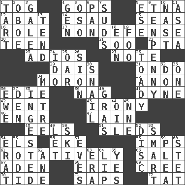 ACROSS 1. Coat; cloak 4. Republicans 8. Inactive volcano in Sicily 12. Blind as ____ 14. Son of Isaac 15. Oceans 16. Hero or heavy, e.g. 17. Unrelated to defense, as in spending 20. Adolescent 21. "Barney Miller" actor Jack 22. Parent Teacher Assoc. 23. Goodbye (Sp.) 27. Observe 29. Raised platform 31. Southwest Nigerian state 34. Person of subnormal intelligence 35. Soon (poet.) 36. Singer Brickell 39. Tired old horse 41. Unit of force 42. Left 43. Literary sarcasm 46. Engineer (abbr.) 47. (Had) reclined 48. Snakelike fish 51. Bobsleighs 54. Raised railways 56. Supplement with great effort 58. Naughty children 61. Happening in regular succession 66. Table seasoning 67. Arabian gulf 68. 4th largest of the Great Lakes 69. Algonquian 70. Periodic rise and fall of the sea level 71. Plant excrements 72. Make lace DOWN 1. Small pie 2. Mitch Miller's instrument 3. An organ shaped like a helmet 4. Commissioned mil. rank 5. Bear (Spanish) 6. Baking dish 7. Beer foam 8. Compass dir. 9. 3-inch nail 10. Political cartoonist Thomas 11. At sea 13. Look after 18. A really long time 19. Egg _ yung 24. Wedding promise 25. Boat paddle 26. The Jewish people; Israel 28. Sycophant 30. Slow-paced one 32. Spanish title 33. Single 34. Distance measurement (Brit.) 36. She-sheep 37. Lair 38. Eaten 40. Pate de foie ____ 44. Lubricate 45. Compass dir. 49. Allow 50. What Jean-Claude Killy likes to do 52. Flat circle 53. Don Adams' spy role 54. Part of Q.E.F. 55. Farming town in central California 57. Nights before holidays 59. Entreaty 60. Proofreading order 62. A saturated hydrocarbon 63. Period 64. Mouth edge 65. Consenting reply