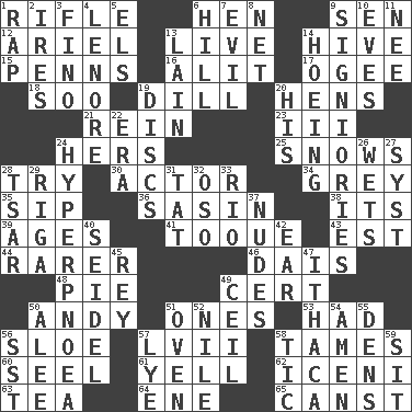 ACROSS 1. Firearm 6. Layer 9. Elected rep. 12. Satellite of Uranus 13. Moving, as bait 14. Hub of activity 15. Actor Sean's family 16. Came down and settled, as after flight 17. Double curve, resembling the letter S 18. "Barney Miller" actor Jack 19. Deli pickle 20. Coop moms 21. It's straight from the horse's mouth 23. One more than two 24. Possessive pronoun 25. Frozen precipitation (plural) 28. Attempt to accomplish something 30. Thespian 34. Jennifer or Joel 35. Small drink 36. Indian antelope 38. ___ a Wonderful Life 39. Eons 41. Woman's close-fitting hat 43. Eastern Standard Time (abbr.) 44. More uncommon 46. Raised platform 48. Sliced dessert 49. Foregone conclusion 50. "60 Minutes" Commentator Rooney 51. Washington bills 53. Possessed 56. _ gin 57. 57 in ancient Rome 58. Corrects by punishment or discipline 60. Sew up the eyelids of hawks and falcons 61. Shout 62. Ancient Celtic tribe of eastern Britain 63. Beverage made from leaves 64. Compass dir. 65. 2nd pers. sing. pres. of can (arch.) DOWN 1. Hit sharply and swiftly 2. Angers 3. Fine (Spanish) 4. Poe poem 5. Raised railways 6. Land elevation 7. Morally bad or wrong 8. Fish or hair follower 9. Seigniories (variant) 10. Nights before holidays 11. Born 13. (Had) reclined 14. Cultivating 19. Flat circles 20. Part of HMS, perhaps 22. Epoch 24. Abnormally rapid or deep breathing 26. Soaks 27. System (abbr.) 28. Russian ruler of old 29. Port city in Latvia 31. Make lace 32. Bear (Spanish) 33. River (Sp.) 37. Unclothed pictures 40. Beer mug 42. Hearing organ 45. Marina Del _, California 47. New York city 49. To provide with a ceiling 50. Toward shelter 51. Baking chamber 52. "Death on the ____" 54. So be it 55. Lairs 56. Fast jet (abbr.) 57. Potassium hydroxide 58. Nervous spasm 59. Be seated