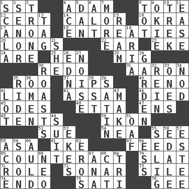 ACROSS 1. Fast jet (abbr.) 4. First man 8. Carry 12. Foregone conclusion 14. Bodily heat indicating an inflammation 16. Gumbo ingredient 17. Small Philippine buffalo 18. Pleas 20. Yearns 22. Hearing organ 23. Make supply last 24. "We ___ not amused" (Victoria) 25. Layer 28. Russian fighter aircraft 30. Do over again 31. Composer Copland 35. Friend of Pooh 37. Pinches, bites 40. Former U.S. Attorney General Janet 41. Pale green bean 42. Indian state 44. Passed on 45. Lyric poems 46. Singer James 47. Followers of ems 48. Portable shelters 50. Image 52. Take to court 54. Teachers' org. 55. Observe 58. White ___ sheet 61. D.D.E's nickname 63. Gives food to 65. Act in opposition 70. Narrow board 71. Hero or heavy, e.g. 72. Echolocation 73. Filth; sediment 74. Inside; within (prefix) 75. Suttee (variant) 76. Turn to the right DOWN 1. Any of the three canals of the cochlea 2. Sir (Sp.) 3. Marketplace scale 4. Adept person 5. One of the 12 tribes of Israel 6. The first octave above the treble staff 7. Greater amount 8. Small child 9. Migrant worker of the '30s 10. Long journey 11. Comfort 13. Label 15. 480, 500 or 516 sheets of paper 19. Roberta Peters solo 21. A female animal or person 26. Pulitzer Prize-winning author Ferber 27. Annoying sound 29. Place where plants grow 30. Ridicules or criticizes harshly 32. It's straight from the horse's mouth 33. Washington bills 34. Dreamland 35. Travel on or in a vehicle 36. Sign of something about to happen 38. Pacific Standard Time (abbr.) 39. Smooth fabric 41. Car dealer's back yard 43. Create 49. Costume for a special activity 51. Clumsy lout 53. Supplements with great effort 55. Major League Baseball Commissioner Bud 56. Peak District village in England 57. First name in cosmetics 58. 1/640 square mile 59. Within a short period 60. Old (Scot.) 62. Greek god of love 64. Curvy letter 66. Modern: prefix 67. Santa ___, CA 68. Feline 69. Three (prefix)