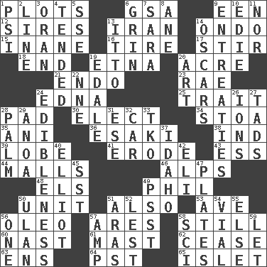 ACROSS 1. Secret plans 6. Girls' org. (abbr.) 9. Car or cant ending 12. Begets 13. SW Asia republic 14. Southwest Nigerian state 15. Silly 16. Hoop that covers a wheel 17. Use a swizzle stick 18. Conclude 19. Inactive volcano in Sicily 20. Measure of real estate 21. Inside; within (prefix) 23. Actress Charlotte 24. Pulitzer Prize-winning author Ferber 25. Distinguishing feature 28. Groovy apt. 30. Choose 34. Portico 35. Cuckoo 36. 1973 Nobel Price Winner (Physics) Leo 38. Working for oneself (abbr.) 39. Ear part 41. Eat (away) 43. Double-curved letter 44. Shopping centers 46. High mountains 48. Raised railways 49. Silvers or Donahue 50. A single undivided whole 51. In addition 53. "___ Maria" 56. Butter sub 57. Ancient Greek god of war 58. Free of sound 60. Political cartoonist Thomas 61. Vertical spar for supporting sails 62. Stop 63. Followers of ems 64. Pacific Standard Time (abbr.) 65. Small island DOWN 1. 23rd letter of the Greek alphabet 2. Actor's bit 3. Northwest Algerian city 4. Looked after 5. Compass dir. 6. Smile widely 7. "Two Mules for Sister ____" 8. A saturated hydrocarbon 9. Pleas 10. Singer Brickell 11. And not 13. "Tell ____ the Marines!" 14. Motion picture awards 19. Peak District village in England 20. Nonscientific branch of learning 22. Compass dir. 24. The property of being fit to eat 26. Charged particles 27. Small amounts or degrees 28. Inside of hand 29. Small Philippine buffalo 31. Compass dir. 32. Automobile 33. Ring climax 37. Potato state 40. American author Paul (1891-1958) 42. Biblical high priest 45. Fast jet (abbr.) 47. Food holders 49. Inconspicuous attention getter 50. Uhlan (variant) 51. Caspian sea tributary 52. For fear that 54. Small bottle 55. Otherwise 56. Single 57. Electrical Unit 58. _-fi 59. Allow