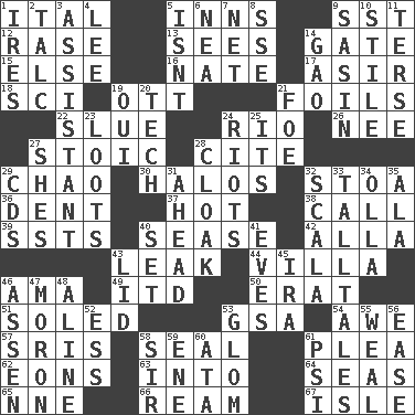 ACROSS 1. Slanted text style (abbr.) 5. Lodging establishments 9. Fast jet (abbr.) 12. Raze (variant) 13. Perceives with the eye 14. Yard entry 15. Otherwise 16. Nathan's nickname 17. SW Saudi Arabia district 18. _-fi 19. Baseball player Mel 21. Fencing necessities 22. Change direction abruptly 24. _ de Janeiro 26. Born 27. Unemotional 28. Quote 29. US Secretary of Labor Elaine L. _ 30. Auras 32. Portico 36. Incision 37. Being at a high temperature 38. Give a ring to 39. Fast planes 40. Gospel singer Marvin 42. Silent film actress Nazimova 43. Path through which fluid escapes 44. Country residence 46. Housemaid (var.) 49. It would 50. Part of Q.E.F. 51. Having a sole or soles 53. Girls' org. (abbr.) 54. Deep reverence 57. Indian titles of respect 58. Lick closed 61. Entreaty 62. Immeasurably long periods of time 63. To the inside or interior of 64. Oceans 65. Compass dir. 66. 480, 500 or 516 sheets of paper 67. Small island DOWN 1. Angers 2. Baby powder 3. Helper 4. Area sheltered from the wind 5. Is not 6. Teachers' org. 7. Fish or hair follower 8. Compass dir. 9. Indian antelope 10. Vertical member of a panel or frame 11. Laconic 14. E Mali city 19. Fr. "Yes" 20. Technology 21. Enemy 23. Plunders 24. Disturbances 25. ___ a Wonderful Life 27. "______ My Girl" (Turtles hit) 28. Anything that covers or conceals 29. Music discs 31. At or in the front 32. Any of the three canals of the cochlea 33. Baron Munchausen's specialties 34. Water jar 35. Chicken ___ king 40. Put into a specified state 41. Nights before holidays 43. Flaplike covering 45. Retirement account (abbr.) 46. NE Netherlands city 47. Person of subnormal intelligence 48. Place in a line 52. Double-curved letter 53. Take by theft 55. Welt 56. Relaxation 58. Title for a knight 59. Compass dir. 60. _ moment's notice (2 wds.) 61. 23rd letter of the Greek alphabet