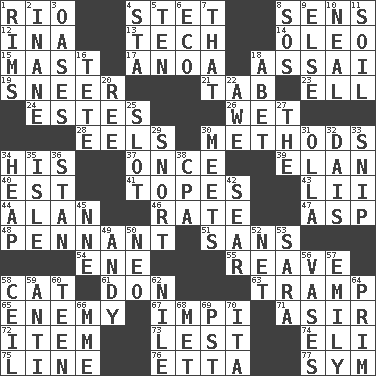 ACROSS 1. _ de Janeiro 4. Proofreading order 8. Elected reps. 12. _ tizzy (2 wds.) 13. Technology 14. Margarine 15. Vertical spar for supporting sails 17. Small Philippine buffalo 18. Slender Brazilian palm 19. Contemptuous expression 21. Keyboard key 23. Pipe bend 24. _____ Park, CO 26. Soggy 28. Snakelike fish 30. Modes 34. Part of HMS, perhaps 37. Single time 39. Style 40. Eastern Standard Time (abbr.) 41. Drinks excessively 43. Cards in a Roman deck? 44. Actor Alda or Thicke 46. Assign a rank or rating to 47. Cleo's killer 48. Pre-World Series prize 51. Without 54. Compass dir. 55. Rob, plunder, or pillage 58. Domesticated feline 61. Spanish title 63. _____ steamer (cargo ship) 65. Foe 67. Body of Kaffir warriors 71. SW Saudi Arabia district 72. Detail 73. For fear that 74. Connecticut Ivy Leaguer 75. Actor's bit 76. Singer James 77. Symbol (abbr.) DOWN 1. Basketball hoops 2. Empty; void 3. Fertile tracts in a desert 4. R.R. building 5. Nine, plus one 6. Environmental prefix 7. Not this but _ 8. Mayday 9. Otherwise 10. Be tempered by heat 11. Land 16. Wig 18. Collude with 20. To separate or throw off 22. Deep reverence 25. Groove 27. Definite Article 29. Derisive sound 30. Confronts 31. Spanish pot 32. Raised platform 33. Clip 34. Pile 35. Small island 36. Comedian Laurel of Laurel & Hardy 38. Numbers guy (abbr.) 42. Dry up 45. Compass dir. 49. Actor Griffith 50. Modern: prefix 52. Fish or hair follower 53. "Two Mules for Sister ____" 56. Flower holders 57. Poet Dickinson 58. To provide with a ceiling 59. Opposed to 60. Adolescent 62. Mediterranean tributary 64. Demure 66. Madame (abbr.) 68. Was introduced to 69. Pacific Standard Time (abbr.) 70. Call ___ day