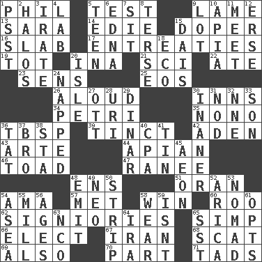 ACROSS 1. Silvers or Donahue 5. Trial 9. Unable to walk 13. "Two Mules for Sister ____" 14. Singer Brickell 15. Drug addict 16. Broad, flat, thick piece 17. Pleas 19. Small child 20. _ tizzy (2 wds.) 21. _-fi 22. Had dinner 23. Elected reps. 25. Greek goddess of the dawn 26. Verbally 30. Taverns 34. _ dish (used to culture cells) 35. Words to Nanette 36. Cook's measure (abbr.) 39. Tinged 42. Arabian gulf 43. Johnson of "Laugh-In" 44. Bee-related 46. Frog relative 47. Indian princess (variant) 48. Followers of ems 51. Northwest Algerian city 54. Wet nurse (var.) 57. Was introduced to 58. Acquire through effort 60. Friend of Pooh 62. Seigniories (variant) 65. Simple or foolish person 66. Choose 67. SW Asia republic 68. Scram, to a cat 69. In addition 70. Role in a play 71. Small boys DOWN 1. Inconspicuous attention getter 2. Auras 3. Feeling or showing extreme anger 4. Experiment locale 5. Adolescent 6. Pulitzer Prize-winning author Ferber 7. Be seated 8. Laconic 9. Car dealer's back yard 10. Capital of Western Samoa 11. Rendezvous 12. Celtic language 15. Raised platform 18. Environmental prefix 20. Small island 24. Slept 27. Baseball player Mel 28. RI univ. 29. Middle Eastern gold or silver currency 30. More empty; more void 31. Allow head to fall sleepily 32. Compass dir. 33. Male child 36. Make lace 37. Sis' sibling 38. R.R. building 40. Accounting whiz (abbr.) 41. Metal container 45. Age 48. Send forth 49. Modern: prefix 50. Long narrow piece of something 52. N. Chile seaport 53. Wanderer 54. At sea 55. Place where flour is made 56. Grows older 58. Erode 59. Is not 61. Elects 63. Non-commissioned officer (abbr.) 64. Lyricist Gershwin 65. Fast jet (abbr.)