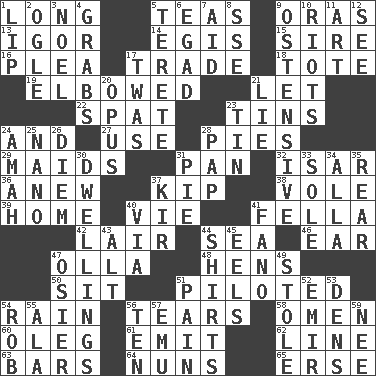 ACROSS 1. Protracted 5. Afternoon social gatherings 9. Mouths or openings 13. Russian composer Stravinsky 14. The front part of a cuirass 15. The founder of a family 16. Entreaty 17. Buy and sell 18. Lug 19. Shoved, as through a crowd 21. Allow 22. Argument over a trivial matter 23. Canisters 24. Added to 27. Purpose 28. Sliced desserts 29. Women servants 31. Baking dish 32. Austrian river, tributary to the Danube 36. Afresh 37. Monetary unit of Laos 38. Grand slam 39. Dwelling 40. Compete 41. Chap (slang) 42. Den 44. Ocean 46. Ewer handle 47. Rounded earthenware pot or jar 48. Coop moms 50. Be seated 51. Manned the helm 54. Water falling in drops from the sky 56. Lacerates 58. Sign of things to come 60. Cassini of fashion 61. Give off 62. Actor's bit 63. Long, evenly shaped pieces 64. Religious women 65. Celtic language DOWN 1. Mouth edge 2. Stare 3. Christmas carol 4. Seizes 5. Cigar-shaped 6. Mild oath 7. Help 8. Compass dir. 9. Clearly or manifestly demonstrative 10. Disturbances 11. Tate display 12. Observe 17. It was, poetically 20. Musical composition 21. Whopper 23. Metal container 24. Housemaid 25. Billionth: prefix 26. South Vietnam president (1954) 28. Infant food 30. Homes 31. Sliced dessert 33. Not divided or shared with others 34. Silent film actress Nazimova 35. Bring up, as a child 37. Apertif with cassis 40. By way of 41. Papal veil 43. Keyboard modifier key 44. Chest coverings 45. Snakelike fish 47. Flexible twig of a willow tree 49. Fur scarf 51. Ache 52. Independent ruler or chieftain 53. Habitations of wild animals 54. Director Reiner 55. According to 56. Nine, plus one 57. Australian flightless bird 59. Born