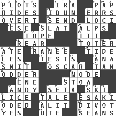 ACROSS 1. Graphs 6. Retirement account (abbr.) 9. Infant food 12. Amusement-park features 13. Goddess of spring and wife of Bragi 14. Blunders 15. Unconcealed 16. Post 17. Event scenes 18. Compass dir. 19. Narrow board 20. High mountains 21. Drink excessively 23. One more than two 24. Stern 25. Carrier 28. Had dinner 30. Indian princess (variant) 34. Event that recurs at intervals 35. French article 36. Trials 38. Santa ___, CA 39. In a ____ (agitated or irritated) 41. Motion picture award 43. Scottish cap 44. More peculiar 46. Thickened enlargement 48. Compass dir. 49. Portico 50. "60 Minutes" Commentator Rooney 51. Bristle 53. What Jean-Claude Killy likes to do 56. Louse (plural) 57. Falsehood 58. 1973 Nobel Price Winner (Physics) Leo 60. Wrote a lyric poem 61. Set down 62. A piece of turf (Scot.) 63. Consenting reply 64. Shoshoni 65. Seines DOWN 1. Adept person 2. Moving, as bait 3. Lyric poems 4. Cylindrical with tapered ends 5. Fast jet (abbr.) 6. It may be bright or harebrained 7. Undersized animal 8. Added to 9. Appease 10. Arches 11. 23rd letter of the Greek alphabet 13. Capri or Wight 14. American author Paul (1891-1958) 19. Small fatty European fish 20. Small island 22. Rowing implement 24. Homes 26. Pulitzer Prize-winning author Ferber 27. 480, 500 or 516 sheets of paper 28. In addition 29. Be inclined (to) 31. Modern: prefix 32. Curvy letter 33. And so on (abbr.) 37. Before Barbara or Clara 40. Looked after 42. Friend of Pooh 45. Marina Del _, California 47. Hyrax 49. Proofreading order 50. Assistant 51. Table seasoning 52. Writer Wiesel 54. Polynesian shrub of the pepper family 55. Visual representation of an object 56. Myrna of the movies 57. The 19th letter of the Greek alphabet 58. Begley and Asner 59. ___ a Wonderful Life