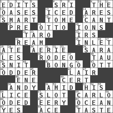 ACROSS 1. Proofreads 6. _ Lanka 9. Definite Article 12. Fertile tracts in a desert 13. On the rocks 14. Ancient Greek god of war 15. Don Adams' spy role 16. Heavy book 17. Patter 18. Before (prefix) 19. Von Bismarck 20. Charged particles 21. Edible starchy tuberous root 23. Big collection agency 24. 480, 500 or 516 sheets of paper 25. An arm off of a larger body of water 28. Had dinner 30. Nest on high 34. "Two Mules for Sister ____" 35. French article 36. Cowboy competition 38. The 19th letter of the Greek alphabet 39. In a ____ (agitated or irritated) 41. Beat drum 43. Baseball player Mel 44. More peculiar 46. Den 48. Compass dir. 49. An absolute certainty 50. Actor Griffith 51. Among 53. Part of HMS, perhaps 56. Louse (plural) 57. Position in a hierarchy or organization 58. Monte _, Las Vegas Hotel/Casino 60. Wrote a lyric poem 61. Suggestive of the supernatural 62. Sea 63. Consenting reply 64. Adept person 65. Clothes sense DOWN 1. Greek goddess of the dawn 2. Moist 3. Austrian river, tributary to the Danube 4. Cylindrical with tapered ends 5. Fast jet (abbr.) 6. Native of Scotland 7. San ____ (Riviera town) 8. Binary compound 9. Interpreter 10. Coop moms 11. Eastern Standard Time (abbr.) 13. "Tell ____ the Marines!" 14. Oak nuts 19. Abalone 20. One more than two 22. Auto club (abbr.) 24. Dwellings 26. Part of Q.E.F. 27. Strained 28. In addition 29. Watch over 31. Director Reiner 32. Wedding promise 33. Car or cant ending 37. Stared at amorously 40. Looked after 42. Rowing implement 45. Marina Del _, California 47. New York city 49. Municipality 50. Helper 51. Actor Baldwin 52. Greater amount 54. Angers 55. Narrow board 56. Myrna of the movies 57. Ocean 58. Small bed 59. Single