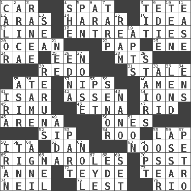 ACROSS 1. Automobile 4. Petty quarrel 8. Wig 12. Ancient river in northeast Turkey 14. Ethiopian city, capital of Harari 16. The main thing one is thinking about 17. Actor's bit 18. Pleas 20. Sea 22. Infant food 23. Compass dir. 24. Actress Charlotte 25. Car or cant ending 28. Mountains (abbr.) 30. Do over again 31. Lacking originality or spontaneity 35. Had dinner 37. Pinches, bites 40. So be it 41. Austrian river, tributary to the Danube 42. NE Netherlands city 44. Charged particles 45. Tall New Zealand timber tree 46. Inactive volcano in Sicily 47. To free from 48. Sports stadium 50. Washington bills 52. Small drink 54. Friend of Pooh 55. Pet locale 58. Call ___ day 61. Daniel's nick name 63. Trap for birds or small mammals 65. Frustrating wastes of time 70. Inconspicuous attention getter 71. Queen of England 1702-14 72. Miss Universe 1986, Barbara Palacios _ 73. Rend 74. Famous astronaut Armstrong 75. For fear that 76. _ de Janeiro DOWN 1. Bodily heat indicating an inflammation 2. N. Chile seaport 3. The wife of a rajah (variant) 4. A female animal or person 5. Baking dish 6. Nonscientific branch of learning 7. Canvas cover 8. Teat (slang) 9. Singer Brickell 10. Adolescent 11. Relaxation 13. Ocean 15. 480, 500 or 516 sheets of paper 19. Flats, for short 21. Born 26. Pulitzer Prize-winning author Ferber 27. Annoying sound 29. Flight of steps 30. Summer TV shows 32. Mine, in Marseilles 33. Grant temporary use of 34. Followers of ems 35. SW Saudi Arabia district 36. Not wild 38. Pacific Standard Time (abbr.) 39. Sir (Sp.) 41. Lyricist Gershwin 43. Billionth: prefix 49. Opera by Verdi 51. Period of immesurable duration 53. Role in a play 55. Failure 56. Slender Brazilian palm 57. Stone: prefix 58. SW Asia republic 59. Prong on a fork 60. Hindu god of fire 62. Christmas carol 64. Choose 66. Cartoonist voice _ Blanc 67. Potassium hydroxide 68. Begley and Asner 69. Put into a specified state