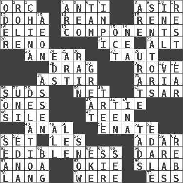 ACROSS 1. The grampus (Milton) 4. Opposed to 8. SW Saudi Arabia district 12. Capital of the state of Qatar 14. 480, 500 or 516 sheets of paper 15. French philosopher Descartes 16. Writer Wiesel 17. Parts 20. Western Nevada city 21. Frozen water 22. The first octave above the treble staff 23. Approach 27. Tense 29. To be drawn or hauled along 31. Be footloose 34. Moving or stirring 35. Operatic vocal solo 36. Beer foam 39. Fish or hair follower 41. Russian ruler of old 42. Washington bills 43. Nick name for Arthur 46. Filth; sediment 47. Adolescent 48. Of or related to the anus 51. Maternal 54. Put into a specified state 56. French article 58. The sixth month of the Jewish calendar 61. The property of being fit to eat 66. Have the gumption 67. Small Philippine buffalo 68. Migrant worker of the '30s 69. Broad, flat, thick piece 70. Austrian-born American filmmaker Fritz 71. We are 72. Double-curved letter DOWN 1. River in Europe 2. Hero or heavy, e.g. 3. Large country 4. Curve 5. Modern: prefix 6. Scottish cap 7. Body of Kaffir warriors 8. "We ___ not amused" (Victoria) 9. Elected representatives 10. International (abbr.) 11. Take ten 13. A really long time 18. Sep. follower 19. Teachers' org. 24. Begley and Asner 25. Nonscientific branch of learning 26. Precipitation 28. A salt of uric acid 30. Relatively large 32. By way of 33. Hearing organ 34. NE Netherlands city 36. Distress signal 37. Single; one (prefix) 38. Conveyance 40. Relationship diagram 44. Nine, plus one 45. _ tizzy (2 wds.) 49. 100% 50. Area sheltered from the wind 52. Small amounts or degrees 53. Peak District village in England 54. Lick closed 55. Pulitzer Prize-winning author Ferber 57. Overwhelm 59. Caspian sea tributary 60. Confederate soldiers (slang) 62. Container for groceries 63. Make supply last 64. Title for a knight 65. Observe