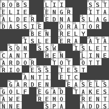 ACROSS 1. Moves up and down 5. Cards in a Roman deck? 8. Fast jet (abbr.) 11. Writer Wiesel 12. Engineer (abbr.) 14. Call ___ day 15. Tree or shrub in the Birch family 17. Pulitzer Prize-winning author Ferber 18. Volcanic refuse 19. Hyrax 21. Speaker 23. Benjamin's nick name 25. Have trust in 26. Small island 27. Epoch 28. _ moment's notice (2 wds.) 31. Male offspring 33. Compass dir. 35. Small island 37. Patter 38. Layer 40. Actor's bit 41. Zeal 43. Small child 45. Baseball player Mel 46. River (Sp.) 47. Curvy letter 50. Trial 52. Against 53. And so on (abbr.) 54. Place where plants grow 56. Artist's stands 61. _ course 62. Mild oath 65. Proceeds 66. Deep reverence 67. San ____ (Riviera town) 68. Monthly bill 69. Compass dir. 70. Health resort 71. Sums up DOWN 1. Necklace unit 2. Spanish pot 3. Auction offers 4. Perceives with the eye 5. Area sheltered from the wind 6. Working for oneself (abbr.) 7. Dismiss 8. Grain storage tower 9. Play the lead 10. Label 13. Less widely known 16. Chest bones 18. Filthy place 20. Snakelike fish 22. Jai _ 24. Soft 26. To the inside or interior of 28. Set down 29. Portable shelter 30. Had dinner 31. Indian skirt 32. Southwest Nigerian state 34. Soggy 36. Position in a hierarchy or organization 37. Auto 39. Short letter 42. Tear apart 44. False hair 48. Navigate 49. Burns superficially 51. Go away! 52. Sandy's bark 54. Bride's dress 55. Toward shelter 57. "Two Mules for Sister ____" 58. Supplemented with great effort 59. Grant temporary use of 60. Fast planes 61. Separate the seeds from cotton 63. Electrical Unit 64. ___ good deed