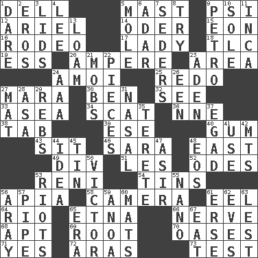 ACROSS 1. Small valley 5. Vertical spar for supporting sails 9. Air pressure measure (abbr.) 12. Satellite of Uranus 14. River in Europe 15. A really long time 16. Cowboy competition 17. Kenny Rogers chart-topper in '80 18. Affectionate concern, for short 19. Double-curved letter 20. Electrical Unit 23. Length times width 24. Mine, in Marseilles 25. Do over again 27. Hindu Mythology: god of death 30. Benjamin's nick name 32. Observe 33. At sea 34. Leave at once 36. Compass dir. 38. Bar bill 39. Compass dir. 40. Chewing product 43. Be seated 46. "Two Mules for Sister ____" 48. Compass direction 49. HTML Container Element 51. French article 52. Lyric poems 53. Painter Guido (1575-1642) 54. Airtight sealed metal containers 56. Capital of Western Samoa 58. Device for capturing images 61. Snakelike fish 64. _ de Janeiro 65. Inactive volcano in Sicily 66. Boldness 68. Fitting 69. Carrot, for example 70. Fertile tracts in a desert 71. It is so 72. Caspian sea tributary 73. Trial DOWN 1. Have the gumption 2. Greek god of love 3. Flaplike coverings 4. Area sheltered from the wind 5. Undercover agent 6. The sixth month of the Jewish calendar 7. Spring feasts 8. Attempt 9. Stone: prefix 10. Not divided or shared with others 11. South American Indian 13. Rich soil 21. Disorderly crowds 22. Parts 23. An important port of Yemen 24. Auto club (abbr.) 26. Car or cant ending 27. Floor covering 28. White ___ sheet 29. Confederate soldiers (slang) 31. Relating to the nose 35. Cigar-shaped 37. Mild oath 41. Purpose 42. Mountains (abbr.) 44. The content of cognition 45. Shallow baking pan 47. SW Saudi Arabia district 48. Greek goddess of the dawn 50. Winning man's name 53. Debaucheries 55. Billionth: prefix 56. Like ___ of sunshine 57. Corncob 59. Small Philippine buffalo 60. Floor protectors 61. Celtic language 62. Nights before holidays 63. For fear that 65. Epoch 67. Erode