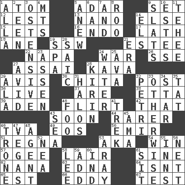 ACROSS 1. Tiny particle 5. The sixth month of the Jewish calendar 9. Put into a specified state 12. For fear that 13. Billionth: prefix 14. Otherwise 15. Allows 16. Inside; within (prefix) 17. Thin strip of wood or metal 18. A saturated hydrocarbon 19. Compass dir. 21. First name in cosmetics 22. California wine valley 24. Armed conflict 26. Compass dir. 27. Slender Brazilian palm 28. Polynesian shrub of the pepper family 29. Opinion 30. Riviera of "Kiss of the Spider Woman" 32. Mail 36. Not recorded 37. "We ___ not amused" (Victoria) 38. Singer James 39. An important port of Yemen 40. Seductive woman who exploits men 42. Not this but _ 43. Within a short period 44. More valued for its uncommonness 46. Federal power corp. 49. Greek goddess of the dawn 50. Arab leader 51. Canadian anthropologist Darnell 53. Alias (abbr.) 54. Acquire through effort 57. Double curve, resembling the letter S 58. Den 61. Trig term 62. Nanny 63. Pulitzer Prize-winning author Ferber 64. Is not 65. Eastern Standard Time (abbr.) 66. Whirlpool 67. Trial DOWN 1. Silent film actress Nazimova 2. Adolescent 3. Clearly or manifestly demonstrative 4. Mountains (abbr.) 5. Afresh 6. One of the 12 tribes of Israel 7. Also 8. Friend of Pooh 9. Narrow boards 10. _____ Park, CO 11. Giggle 14. Raised railways 19. Health resort 20. Ketch in the Levant 21. Period 23. NE Netherlands city 24. Wetness 25. Actress Gardner 27. Enthusiastic 28. Japanese brewing company 29. In the manner of 31. Auras 32. _ dish (used to culture cells) 33. Else 34. Play the lead 35. Make lace 40. Egg _ yung 41. Long journey 43. Ocean 45. Nanny (var.) 46. Heavy duty weighing machine 47. Viva Las _ 48. Representative 52. Teachers' org. 53. Like ___ of sunshine 55. Restaurants 56. Remaining after all deductions 58. Area sheltered from the wind 59. Increase 60. Working for oneself (abbr.) 61. Be seated