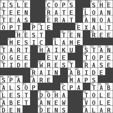 ACROSS 1. Capri or Wight 5. 911 reaches them 9. A female animal or person 12. Adolescent 13. Assign a rank or rating to 14. Grant temporary use of 15. Beverages made from leaves 16. Part of Q.E.F. 17. Small Philippine buffalo 18. Elect 19. Sliced dessert 21. Glorify 22. Behest 24. "___ Little Indians" 26. To separate or throw off 27. Of or pertaining to a meson 28. Unable to walk 29. Small pie 30. Japanese poetic form 32. Comedian Laurel of Laurel & Hardy 36. Double curve, resembling the letter S 37. Night before a holiday 38. Drink excessively 39. Periodic rise and fall of the sea level 40. Obtain by seizing forcibly or violently 42. To erase 43. Precipitation 44. Remain 46. Health resort 49. "We ___ not amused" (Victoria) 50. Atlas contents 51. Columnist Joseph or Stewart 53. Tax preparer (abbr.) 54. Keyboard key 57. For fear that 58. Capital of the state of Qatar 61. Lacquered or enameled metalware 62. Collude with 63. Afresh 64. Short-tailed, large-bodied rat 65. Lair 66. Cub Scout units 67. Having or resembling wings DOWN 1. "Tell ____ the Marines!" 2. Ooze 3. Resembling or made to resemble leather 4. Followers of ems 5. Algonquian 6. Boat paddle 7. Parent Teacher Assoc. 8. Arrange properly for use 9. Echolocation 10. White Person, in Hawaii 11. Maternal 14. Not strict 19. Air pressure measure (abbr.) 20. Hankering 21. Compass dir. 23. First name in cosmetics 24. Proceeds 25. Australian flightless bird 27. Wise men 28. Make or become more lively 29. Small child 31. Nest on high 32. Remove all contents or possession from 33. Inedible or poisonous agaric 34. Domed church section 35. Born 40. Armed conflict 41. Pack (down) 43. Reproach for some lapse or misdeed 45. Sound made by sheep 46. First course 47. First-year military academy student 48. NE Netherlands city 52. Baseball player Mel 53. Crow sounds 55. Silent film actress Nazimova 56. Fermented drink made from hops 58. Male parent 59. Single 60. Layer 61. Federal power corp.