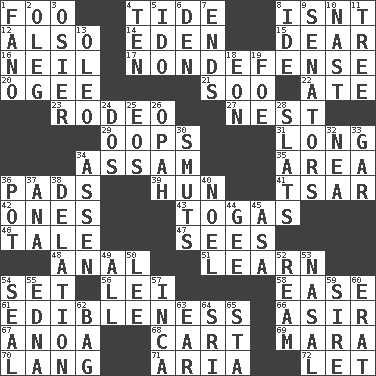 ACROSS 1. Egg _ yung 4. Periodic rise and fall of the sea level 8. Is not 12. In addition 14. Paradise 15. Letter starter 16. Famous astronaut Armstrong 17. Unrelated to defense, as in spending 20. Double curve, resembling the letter S 21. "Barney Miller" actor Jack 22. Had dinner 23. Cowboy competition 27. A home for chicks 29. I made a mistake 31. Yearn 34. Indian state 35. Length times width 36. Writing tablets 39. Attila the _ 41. Russian ruler of old 42. Singles 43. Ancient Roman robes 46. Story 47. Perceives with the eye 48. Of or related to the anus 51. Acquire or gain knowledge or skills 54. Arrange properly for use 56. Flowery wreath 58. Relaxation 61. The property of being fit to eat 66. SW Saudi Arabia district 67. Small Philippine buffalo 68. Draw slowly or heavily 69. Hindu Mythology: god of death 70. Austrian-born American filmmaker Fritz 71. Operatic vocal solo 72. Allow DOWN 1. Papal veil 2. Cassini of fashion 3. Flexible twig of a willow tree 4. "___ Little Indians" 5. Wedding promise 6. Lair 7. Extremities 8. Binary compound 9. Legislators 10. Political cartoonist Thomas 11. Family _ (genealogy) 13. Butter sub 18. Age 19. Enemy 24. Two (Sp.) 25. Greek goddess of the dawn 26. Brightly colored fish 28. Narrow boards 30. Obscenities 32. Teachers' org. 33. Slender fish 34. NE Netherlands city 36. Cooking vessel 37. Santa ___, CA 38. Conveyance 40. Christmas carol 44. Turn to the right 45. White ___ sheet 49. Everything 50. Area sheltered from the wind 52. 480, 500 or 516 sheets of paper 53. Relating to the nose 54. Lick closed 55. Pulitzer Prize-winning author Ferber 57. South American Indian 59. Father 60. Part of Q.E.F. 62. Container for groceries 63. Ewer handle 64. Indian title of respect (Mr.) 65. R.R. building