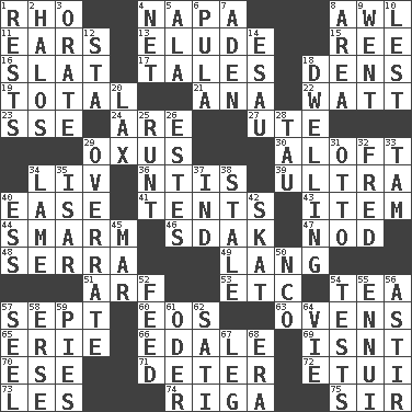 ACROSS 1. 17th letter of the Greek alphabet 4. California wine valley 8. Leather borer 11. Hearing organs 13. Dodge 15. Portuguese money of account (variant) 16. Narrow board 17. Stories 18. Habitations of wild animals 19. "_____ Recall" 21. Santa ___, CA 22. Electrical Unit 23. Compass dir. 24. "We ___ not amused" (Victoria) 27. Shoshoni 29. The longest river in Central Asia 30. At or to great height 34. 54 in ancient Rome 36. Nuclear Threat Initiatives 39. Extremist 40. Relaxation 41. Portable shelters 43. A whole individual unit 44. Excessive but superficial compliments 46. Neighbor of Neb. 47. Allow head to fall sleepily 48. Spanish missionary in California 49. Austrian-born American filmmaker Fritz 51. Sandy's bark 53. And so on (abbr.) 54. Afternoon social gathering 57. Back-to-school mo. 60. Greek goddess of the dawn 63. Baking chambers 65. One of the Great Lakes 66. Peak District village in England 69. Is not 70. Compass dir. 71. Prevent from occurring 72. Needle case 73. French article 74. Port city in Latvia 75. Title for a knight DOWN 1. Musical pauses 2. Rings 3. Speak pompously 4. Fish or hair follower 5. Insect wing 6. Monetary unit of Botswana 7. An important port of Yemen 8. Length times width 9. Gone 10. For fear that 12. R.R. building 14. He sold his birthright 18. Residence 20. Not strict 25. The smallest animal of a litter 26. _____ Park, CO 28. The 19th letter of the Greek alphabet 29. Make much ado about nothing 31. Von Bismarck 32. Flintstone 33. Scottish cap 34. Unable to walk 35. Austrian river, tributary to the Danube 37. Indiana (abbr.) 38. Showing deterioration from age 40. Curvy letter 42. Three-handed card game 45. Impair 50. Non-commissioned officer (abbr.) 52. Nourish 54. Trials 55. World-weariness 56. Being in motion 57. Sew up the eyelids of hawks and falcons 58. Celtic language 59. Sliced desserts 61. River in Europe 62. Suttee (variant) 64. Compete 67. Part of a journey 68. Period