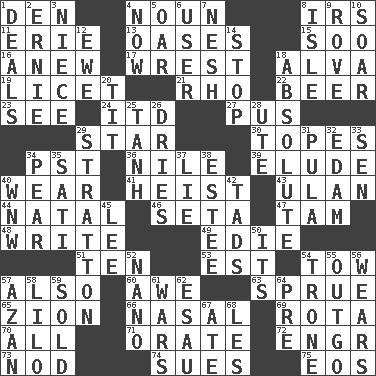 ACROSS 1. Lair 4. Part of speech 8. Big collection agency 11. 4th largest of the Great Lakes 13. Fertile tracts in a desert 15. "Barney Miller" actor Jack 16. Afresh 17. Take or capture by force 18. Inventor's middle name 19. It is permitted: Lat. 21. 17th letter of the Greek alphabet 22. Fermented drink made from hops 23. Observe 24. It would 27. Fluid product of inflammation 29. Play the lead 30. Drinks excessively 34. Pacific Standard Time (abbr.) 36. "Death on the ____" 39. Evade 40. Put on (as clothing) 41. Robbery 43. Uhlan (variant) 44. Brizilian seaport 46. Bristle 47. Scottish cap 48. Compose 49. Singer Brickell 51. "___ Little Indians" 53. Eastern Standard Time (abbr.) 54. Pull behind 57. In addition 60. Deep reverence 63. Upset 65. The Jewish people; Israel 66. Rhinal 69. Round or rotation of duties 70. 100% 71. Speak pompously 72. Engineer (abbr.) 73. Dreamland 74. Institutes legal proceedings 75. Greek goddess of the dawn DOWN 1. Allots cards 2. Bert's buddy 3. Sibling's daughter 4. Immediately 5. Rowing implement 6. One who makes use of a thing 7. Tender 8. Capri or Wight 9. Be footloose 10. Fly high 12. She-sheep 14. Halt 18. Utter; complete 20. Teat (slang) 25. Hyperbolic tangent 26. Frees from moisture 28. Shoshoni 29. Ski resort town in Vermont 31. Monetary unit of Botswana 32. Dutch treat 33. Elected rep. 34. Lightbulb-shaped fruit 35. Suttee (variant) 37. Untruth 38. First name in cosmetics 40. Compass dir. 42. Bits 45. Area sheltered from the wind 50. ___ a Wonderful Life 52. Billionth: prefix 54. Heavy duty weighing machine 55. Expenditure 56. Erodes 57. Muslim summons to prayer 58. _ and Stitch 59. Disposed of to a purchaser 61. Armed conflicts 62. He sold his birthright 64. Before (prefix) 67. Had dinner 68. French article