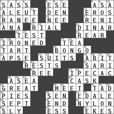 ACROSS 1. Backtalk 5. Compass dir. 8. White ___ sheet 11. Eskimo relative 13. Lair 14. Greek god of love 15. The wife of a rajah (variant) 16. Born 17. Painter Guido (1575-1642) 18. Santa ___, CA 19. Monetary unit of Yemen 21. Middle Eastern gold or silver currency 22. Trial 24. Hitchcock's "____ Window" 25. Pressed 27. Beverage made from leaves 29. Small pie 30. Beat drum 32. Domed church section 33. Sets or collections 35. "This won't hurt ____!" 39. Musical pauses 41. Indian skirt 42. To sift 43. Medicinal drug used to evoke vomiting 45. Toward the sea 48. Keg 49. Relatively large 50. Rendezvous 52. Small amount or degree 55. Sliced desserts 56. Elected rep. 57. Peak District village in England 59. Back-to-school mo. 60. Conclude 61. High-strength synthetic material 62. Secret 63. Double-curved letter 64. Makes supply last DOWN 1. "Two Mules for Sister ____" 2. Actor Alda or Thicke 3. Elected representatives 4. Institute legal proceedings 5. Pulitzer Prize-winning author Ferber 6. Sew up the eyelids of hawks and falcons 7. Compass dir. 8. Sports stadium 9. Underwater navigation system 10. SW Saudi Arabia district 12. Laconic 14. 4th largest of the Great Lakes 20. It would 21. To trail on the ground 23. Keyboard key 25. Call ___ day 26. Strike 27. Small child 28. Followers of ems 30. Again 31. Fertile tracts in a desert 33. Compass dir. 34. Shoshoni 36. Sass 37. Lyricist Gershwin 38. Nervous spasm 40. Part of Q.E.F. 43. Frozen water 44. Eucharist need 45. Satellite of Uranus 46. Not well drained, as in land 47. Compass direction 49. Global Positioning Systems (abbr.) 50. Not women's 51. Conclusions 53. _ vera 54. Habitations of wild animals 56. Perceive with the eye 58. Color