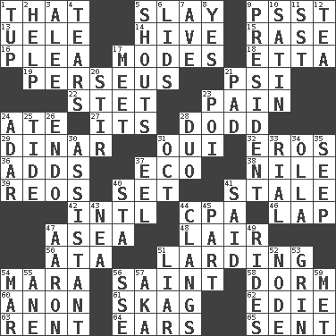 ACROSS 1. Not this but _ 5. Kill 9. Inconspicuous attention getter 13. Ubangi River tributary 14. Hub of activity 15. Raze (variant) 16. Entreaty 17. Methods 18. Singer James 19. Son of Zeus who helped slay Medusa 21. Air pressure measure (abbr.) 22. Proofreading order 23. Ache 24. Had dinner 27. It is 28. Texas town _ City 29. Middle Eastern gold or silver currency 31. Fr. "Yes" 32. Greek god of love 36. Sums up 37. Environmental prefix 38. The longest river in the world 39. Vintage cars 40. Put into a specified state 41. Showing deterioration from age 42. International (abbr.) 44. Tax preparer (abbr.) 46. Pet locale 47. Toward the sea 48. Den 50. _ moment's notice (2 wds.) 51. Preparing or cooking with lard 54. Hindu Mythology: god of death 56. Inhabitant of Heaven 58. Dormintory (informal) 60. Soon (poet.) 61. Heroin 62. Singer Brickell 63. Monthly bill 64. Hearing organs 65. Posted DOWN 1. Uncastrated adult male sheep 2. Aid 3. Toward shelter 4. Rends 5. Yells 6. Flaplike coverings 7. "___ Maria" 8. Consenting reply 9. Elected leader of a country 10. Smooth fabric 11. Fast jet (abbr.) 12. Beverage made from leaves 17. Rendezvous 20. Agitate 21. Groovy apt. 23. Luau course 24. The sixth month of the Jewish calendar 25. Periodic rise and fall of the sea level 26. Inside; within (prefix) 28. Superhero pair 30. Helper 31. Sep. follower 33. Monetary unit of Yemen 34. Spanish pot 35. Ooze 37. Snakelike fish 40. R.R. building 41. Stated 43. Teachers' org. 44. Rings like a ship's bell 45. Role in a play 47. Composer Copland 49. Amusement-park features 51. One who doesn't tell the truth 52. Connecting point 53. Smile widely 54. Make imperfect 55. A saturated hydrocarbon 56. Compass dir. 57. Alias (abbr.) 59. Was introduced to