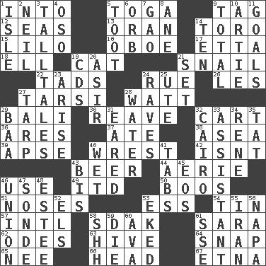 ACROSS 1. To the inside or interior of 5. Ancient Roman robe 9. Label 12. Oceans 13. Northwest Algerian city 14. "Corrida" creature 15. _ and Stitch 16. Mitch Miller's instrument 17. Singer James 18. Pipe bend 19. Domesticated feline 21. Slow-paced one 22. Small boys 24. Regret 26. French article 27. Tarsus (plural) 28. Electrical Unit 29. Indonesian resort city 30. Rob, plunder, or pillage 32. Heavy open wagon 36. Ancient Greek god of war 37. Had dinner 38. At sea 39. Domed church section 40. Obtain by seizing forcibly or violently 42. Is not 43. Fermented drink made from hops 44. Nest on high 46. Purpose 49. It would 50. Expressions of contempt or scorn 51. Olfactory organs 53. Double-curved letter 54. Metal container 57. International (abbr.) 58. Neighbor of Neb. 61. "Two Mules for Sister ____" 62. Lyric poems 63. Hub of activity 64. Fastener 65. Born 66. Froth on beer 67. Inactive volcano in Sicily DOWN 1. Capri or Wight 2. Famous astronaut Armstrong 3. Baron Munchausen's specialties 4. Bear (Spanish) 5. A blast of a horn 6. Globe 7. E Mali city 8. A saturated hydrocarbon 9. Add up to 10. Nick name for Arthur 11. Finish lines 14. Nine, plus one 19. Music discs 20. SW Saudi Arabia district 21. Arrange properly for use 23. Originate 24. All-night dance parties 25. Shoshoni 27. Canvas cover 28. Wetness 29. Sound made by sheep 31. Having ears or earlike features 32. Capital of Egypt 33. Aide 34. French philosopher Descartes 35. Make lace 40. Soggy 41. Bar bills 43. Again 45. Greek goddess of the dawn 46. The state of being joined or united 47. Something which is sent 48. First name in cosmetics 52. Raised railways 53. Made supply last 55. SW Asia republic 56. California wine valley 58. Quiet! 59. Expire 60. Actress Gardner 61. Compass dir.