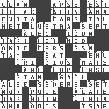ACROSS 1. Burrowing marine mollusk 5. Domed church section 9. Eastern Standard Time (abbr.) 12. Pale purple color 14. Wagers 15. Santa ___, CA 16. Webber/Rice musical 17. Hearing organs 18. The 19th letter of the Greek alphabet 19. Was introduced to 20. A period of five years 23. Back-to-school mo. 24. Actor Baldwin 25. Goddess of spring and wife of Bragi 27. Small pie 30. Car dealer's back yard 32. Lower and raise head in agreement 33. Migrant worker of the '30s 34. Blunders 36. Compass dir. 38. Scottish cap 39. Consume 40. Australian flightless bird 43. RI univ. 46. "Vaya con ____" 48. Floor coverings 49. "We ___ not amused" (Victoria) 51. Chop off 52. Celtic language 53. Comedian Laurel of Laurel & Hardy 54. Highlander 56. Toward shelter 58. Spring feasts 61. Arrange properly for use 64. And not 65. Whimper 66. Having winglike extensions 68. Rowing implement 69. It's straight from the horse's mouth 70. National forest in Provo, Utah 71. Nursemaid (var.) 72. Lyric poems 73. Austrian river, tributary to the Danube DOWN 1. To starve (Brit.) 2. Not recorded 3. Set down 4. Floor protector 5. Collude with 6. Lightbulb-shaped fruit 7. Put through a sieve 8. Curvy letter 9. Ingested 10. Fastener 11. Pulled tight 13. Give a ring to 21. Ubangi River tributary 22. Tallied 23. Soap bubbles 24. Had dinner 26. Two (Sp.) 27. Small child 28. Alias (abbr.) 29. Tall New Zealand timber tree 31. Drop behind 35. Moe Howard, for one 37. Erode 41. Mountains (abbr.) 42. Purpose 44. Assign a rank or rating to 45. Retirement account (abbr.) 47. Practice fight 48. Cartoonist voice _ Blanc 50. Took place subsequently 53. Spanish missionary in California 55. Son of Isaac 56. Small Philippine buffalo 57. Rich soil 59. Writer Wiesel 60. Hiding places for outlaws 61. Without 62. Singer James 63. Rend 65. Adept person 67. Cards in a Roman deck?