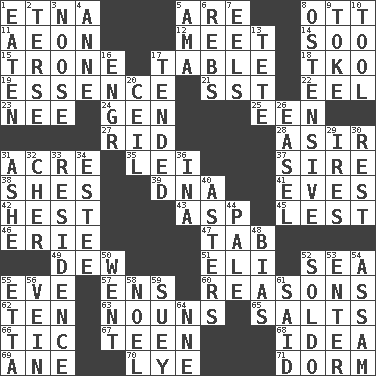 ACROSS 1. Inactive volcano in Sicily 5. "We ___ not amused" (Victoria) 8. Baseball player Mel 11. A really long time 12. Rendezvous 14. "Barney Miller" actor Jack 15. Heavy duty weighing machine 17. Eating place 18. Ring climax 19. Core 21. Fast jet (abbr.) 22. Snakelike fish 23. Born 24. Commissioned mil. rank 25. Car or cant ending 27. To free from 28. SW Saudi Arabia district 31. 1/640 square mile 35. Flowery wreath 37. Beget 38. "______ My Girl" (Turtles hit) 39. Heredity factor (abbr.) 41. Nights before holidays 42. Behest 43. Viper 45. For fear that 46. 4th largest of the Great Lakes 47. Bar bill 49. Morning condensation 51. Connecticut Ivy Leaguer 52. Ocean 55. Night before a holiday 57. Followers of ems 60. Thinks logically 62. Nine, plus one 63. Parts of speech 65. Table seasonings 66. Nervous spasm 67. Adolescent 68. The main thing one is thinking about 69. One (Scot) 70. Sodium hydroxide 71. Dormintory (informal) DOWN 1. Eroded 2. Laconic 3. Trap for birds or small mammals 4. Queen of England 1702-14 5. Housemaid (var.) 6. Confederate soldiers (slang) 7. Snakelike fish 8. Clearly or manifestly demonstrative 9. Puff or smoke 10. Utensil 13. False hair 16. Engineer (abbr.) 17. Looked after 20. To provide with a ceiling 26. Artist's stand 29. Angers 30. Respite 31. American tennis player Robert 32. "Mermaids" star 33. Dwelling 34. First name in cosmetics 36. _ tizzy (2 wds.) 40. Michaelmas daisies 44. Diluted with white 48. Prejudice 50. Left 52. Twentieth part of a lira 53. Keyboard key 54. Indian state 55. Singer James 56. Distinctive style or manner 58. Christmas carol 59. Chop _ 61. Alleged 64. Compass dir.