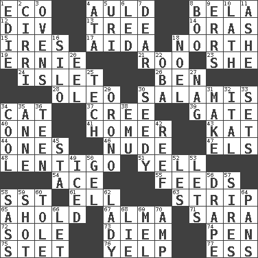 ACROSS 1. Environmental prefix 4. Old (Scot.) 8. Actor Lugosi 12. HTML Container Element 13. Woody plant 14. Mouths or openings 15. Angers 17. Opera by Verdi 18. Compass direction 19. Bert's buddy 21. Friend of Pooh 23. A female animal or person 24. Small island 26. Benjamin's nick name 28. Butter sub 30. Deli grouping 34. Feline 37. Algonquian 39. Yard entry 40. Single 41. Simpsons dad 43. Krazy ___ of comics 44. Washington bills 46. Unadorned 47. Raised railways 48. Small, flat, pigmented spot on the skin 51. Shout 54. Adept person 55. Gives food to 58. Fast jet (abbr.) 61. Pipe bend 63. Empty completely 65. Hold, grip (Informal) 67. _ mater 71. "Two Mules for Sister ____" 72. Not divided or shared with others 73. South Vietnam president (1954) 74. Animal enclosure 75. Proofreading order 76. Sharp bark 77. Curvy letter DOWN 1. Singer Brickell 2. High-altitude cloud 3. Baking chambers 4. _ moment's notice (2 wds.) 5. RI univ. 6. Directed 7. Letter starter 8. Surprise greeting 9. Blunders 10. Thin strip of wood or metal 11. American tennis player Robert 16. Grain storage tower 18. Christmas carol 20. Snakelike fish 22. Chief or king in Benin or Nigeria 25. Technician 27. Tired old horse 29. U. of Maine site 30. Morally degraded 31. Cause to be 32. Slanted text style (abbr.) 33. Arranges properly for use 34. Calm and collected 35. Singer Murray 36. Adolescent 38. Australian flightless bird 42. Coral ridge 45. R.R. building 49. On the rocks 50. Set 52. French article 53. Allows 56. Window treatment 57. Founders of families 58. Backtalk 59. Guess 60. Lacquered or enameled metalware 62. Kenny Rogers chart-topper in '80 64. Baking dishes 66. Allow 68. Untruth 69. Cartoonist voice _ Blanc 70. Electrical Unit