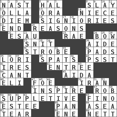 ACROSS 1. Political cartoonist Thomas 5. Actor Linden 8. Kill 12. Spanish pot 13. Mouth or opening 14. Sibling's daughter 15. South Vietnam president (1954) 16. Seigniories (variant) 19. Conclusion 20. Thinks logically 21. Son of Isaac 23. Actress Charlotte 24. Ribbon knot 27. In a ____ (agitated or irritated) 30. Helper 31. Disco prop 34. Groovy apts. 35. Australian parrot (variant) 38. Arguments over trivial matters 40. Inconspicuous attention getter 41. Angers 42. Main course 44. Patter 45. Opera by Verdi 46. Connecticut Ivy Leaguer 47. Enemy 50. SW Asia republic 53. Heighten or intensify 57. Director Reiner 59. Supplying deficiencies 63. Fine (Spanish) 64. First name in cosmetics 65. Baking dish 66. At sea 67. Separate forcefully 68. Compass dir. 69. Remaining after all deductions DOWN 1. Thickened enlargement 2. Place in a line 3. Bobsleighs 4. Scottish cap 5. Stockings 6. Operatic vocal solo 7. Falls behind 8. Title for a knight 9. Luau accessory 10. Adept person 11. It is so 14. Olfactory organ 17. And not 18. _ tizzy (2 wds.) 20. Undersized animal 22. Aid 24. Prejudice 25. Probability 26. Compass direction 28. Big collection agency 29. Drink excessively 30. Become visible 32. Forbid 33. Singer James 35. Louse (plural) 36. Taken by mouth 37. Painter Guido (1575-1642) 39. _ Lanka 43. Singer Brickell 47. Do some clerical work 48. Single 49. Eastern Standard Time (abbr.) 51. Ascend 52. Music written for nine 54. Corncob 55. "Terrible" tsar 56. French philosopher Descartes 58. Water vessel 59. Put into a specified state 60. Purpose 61. Parent Teacher Association (abbr.) 62. For each 63. Avid follower