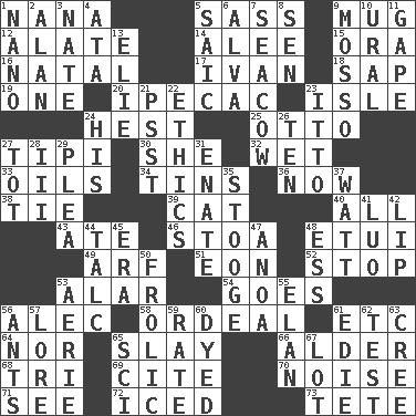 ACROSS 1. Nanny 5. Backtalk 9. Java container 12. Having winglike extensions 14. Toward shelter 15. Mouth or opening 16. Brizilian seaport 17. _ the terrible 18. Plant excrement 19. Single 20. Medicinal drug used to evoke vomiting 23. Small island 24. Behest 25. Von Bismarck 27. Native american tent (variation) 30. A female animal or person 32. Dripping 33. Petroleums 34. Metal containers 36. Immediately 38. Make a knot 39. Domesticated feline 40. Everything 43. Had dinner 46. Portico 48. Needle holder 49. Sandy's bark 51. Age 52. Constrict 53. Having or resembling wings 54. Leaves 56. Actor Baldwin 58. Severe or trying experience 61. And so on (abbr.) 64. And not 65. Kill 66. Tree or shrub in the Birch family 68. Three (prefix) 69. Quote 70. Annoying sound 71. Perceive with the eye 72. On the rocks 73. Wig DOWN 1. Billionth: prefix 2. Actor Alda or Thicke 3. Nathan's nickname 4. _ moment's notice (2 wds.) 5. Ketch in the Levant 6. Inventor's middle name 7. Manatee 8. Elected rep. 9. With motion or animation 10. Mountain range 11. Open wide 13. Writer Wiesel 21. Inconspicuous attention getter 22. Principles of right and wrong 23. "Tell ____ the Marines!" 24. Part of HMS, perhaps 26. Nine, plus one 27. Small child 28. One more than two 29. Entreaty 31. Related on the mother's side 35. Moe Howard, for one 37. Electrical Unit 41. Nilotic language 42. Mouth edge 44. Baby powder 45. Epoch 47. Small Philippine buffalo 48. Curvy letter 50. Play 53. Nest on high 55. Liveliness 56. Pismires 57. Old wives' tales, e.g. 59. Assign a rank or rating to 60. Colored 61. Singer Brickell 62. Trial 63. Algonquian 65. _-fi 67. Car dealer's back yard
