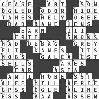 ACROSS 1. Desist 6. Tate display 9. Boy, to dad 12. Stared at amorously 13. Scent 14. Flintstone garb 15. Domesticates 16. Depend 17. Double curve, resembling the letter S 18. June honoree 19. Object of repulsion 20. Coop moms 21. Merit 23. One more than two 24. 4th largest of the Great Lakes 25. Overwhelms 28. Possessed 30. Debunk (Brit. slang) 34. Jennifer or Joel 35. Biblical high priest 36. Natives or inhabitants of Denmark 38. ___ a Wonderful Life 39. Disorderly crowds 41. An organ shaped like a helmet 43. Eastern Standard Time (abbr.) 44. Exchanges for money 46. Ancient Greek god of war 48. Ewer handle 49. At sea 50. Against 51. Loose flowing garment 53. Fast jet (abbr.) 56. Toward shelter 57. Place where flour is made 58. Nest on high 60. Global Positioning Systems (abbr.) 61. Stare at amorously 62. Place in a line 63. Curvy letter 64. Sound made by sheep 65. NE Netherlands city DOWN 1. Small bed 2. Mild oath 3. _ mater 4. Sowing specialist 5. Begley and Asner 6. Arabian gulf 7. Hero or heavy, e.g. 8. Attempt to accomplish something 9. Seigniories (variant) 10. Lyric poems 11. Born 13. NW Algerian seaport 14. Weeding 19. A special lineage 20. Part of HMS, perhaps 22. Help 24. The property of being fit to eat 26. Moistens 27. System (abbr.) 28. Is hesitant and indecisive 29. Medicinal plant 31. Container for groceries 32. Santa ___, CA 33. Set 37. Gospel singer Marvin 40. Chalkboards 42. "We ___ not amused" (Victoria) 45. _ Lanka 47. Artist's stands 49. Competent 50. High mountains 51. Port city in Latvia 52. Water jar 54. Indian titles of respect 55. Prong on a fork 56. Grow older 57. Crowd into 58. American Automobile Association (abbr.) 59. Car or cant ending