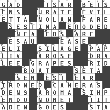 ACROSS 1. E Mali city 4. Russian ruler of old 8. Stakes 12. Followers of ems 13. A salt of uric acid 14. Morally bad or wrong 15. Singer James 17. Pitcher Ryan 18. Conductor's collection 19. French poetic form 21. Eaten away 23. Teachers' org. 24. Begley and Asner 26. "We ___ not amused" (Victoria) 27. He sold his birthright 28. Comfort 30. Connecticut Ivy Leaguer 31. Fodder prepared in a silo 34. Infant food 37. 54 in ancient Rome 38. Came up 39. Mouth or opening 40. Area sheltered from the wind 41. Raisin fruits 42. To free from 43. Water vessel 44. Stalk of a moss capsule 46. Elected rep. 47. Eastern Standard Time (abbr.) 50. Ewer handle 51. Pressed 54. Devices for capturing images 57. Hiding places for outlaws 58. Scent 60. Simple or foolish person 62. Inside; within (prefix) 63. Music written for nine 64. Teat (slang) 65. An important port of Yemen 66. Leaves 67. R.R. building DOWN 1. Unit of force equal to gravity 2. Pismires 3. Clearly or manifestly demonstrative 4. Marketplace scale 5. First course 6. _ moment's notice (2 wds.) 7. French philosopher Descartes 8. Prior to 9. Elude 10. Become fatigued 11. Downhill vehicle 13. Single; one (prefix) 16. Toward the sea 20. The 19th letter of the Greek alphabet 22. Raze (variant) 25. Gospel singer Marvin 27. Writer Wiesel 29. Grows older 30. Pipe bend 31. "Two Mules for Sister ____" 32. Feeling or showing extreme anger 33. Trim (branches) 34. Likenesses of persons 35. Roberta Peters solo 36. Groovy apt. 41. Went 43. Gillaume's butler role 44. Perceive with the eye 45. Hearing organs 46. Message 48. Biscuitlike quick bread 49. Makes less strong or intense 51. The content of cognition 52. Tear apart 53. Mild oath, euphamism for damn 55. Floor protector 56. Stricken, poetically 59. Friend of Pooh 61. Parent Teacher Association (abbr.)