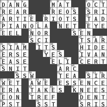 ACROSS 1. Mild oath, euphamism for damn 5. Floor protector 8. Sep. follower 11. Located in or toward the back 12. Vintage cars 14. _ Lanka 15. Nick name for Arthur 17. Disturbances 18. Small boy 19. Player piano 21. Fish or hair follower 22. Sight organ 23. Snakelike fish 24. And not 25. Elected rep. 27. _-fi 28. Russian ruler of old 31. Thailand, formerly 35. ___ a Wonderful Life 37. Flintstone garb 38. Celtic language 39. Affirmative reply 41. _ the terrible 42. Comfort 43. Biblical high priest 45. Certainty 46. In a ____ (agitated or irritated) 47. Curve 49. Compass dir. 51. Beverage made from leaves 52. Title for a knight 55. Dripping 57. Deep reverence 60. Gist 62. Epoch 63. Receives possession of 65. Leg joints 66. Period of immesurable duration 67. Unclean, religiously 68. Incision 69. Pacific Standard Time (abbr.) 70. Fast jet (abbr.) 71. Indian titles of respect DOWN 1. Window treatment 2. Nest on high 3. Brizilian seaport 4. Amused look 5. Medical imaging device (abbr.) 6. A really long time 7. Carry 8. Clearly or manifestly demonstrative 9. Supercomputer manufacturer 10. Periodic rise and fall of the sea level 13. Fast planes 16. Immeasurably long periods of time 17. Noteworthy scarcity 20. Locales 26. Value system 29. The sixth month of the Jewish calendar 30. Monthly bill 31. Observes 32. SW Asia republic 33. Aide 34. Confronts 36. Perceive with the eye 40. Chalkboards 44. Angers 48. Keg 50. Electrical Unit 52. Scornful expression 53. Ancient Celtic tribe of eastern Britain 54. Musical pauses 55. Shed a tear 56. Greek god of love 58. Armed conflicts 59. Makes supply last 61. Conclusions 64. Lizard (obsolete)