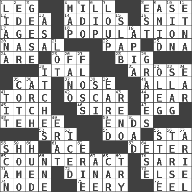 ACROSS 1. Part of a journey 4. Place where flour is made 8. Relaxation 12. It may be bright or harebrained 14. Goodbye (Sp.) 16. Stricken, poetically 17. Grows older 18. Census information 20. Relating to the nose 22. Infant food 23. Heredity factor (abbr.) 24. "We ___ not amused" (Victoria) 25. No longer planned or scheduled 28. Large 30. Slanted text style (abbr.) 31. Came up 35. Domesticated feline 37. Sense of smell 40. Silent film actress Nazimova 41. Torque (variant) 42. Motion picture award 44. Lightbulb-shaped fruit 45. Hankering 46. Beget 47. Oval reproductive body of a fowl 48. Giggle 50. Extremities 52. Indian title of respect (Mr.) 54. ___ good deed 55. R.R. building 58. Quiet! 61. Adept person 63. Prevent from occurring 65. Frustrate 70. Indian skirt 71. So be it 72. Middle Eastern gold or silver currency 73. Otherwise 74. Thickened enlargement 75. Suggestive of the supernatural 76. Snakelike fish DOWN 1. Woody, climbing, usually tropical plant 2. _ Allan Poe 3. Honkers 4. Atlas unit 5. Wedding promise 6. Mouth edge 7. Central Nebraska county 8. Eastern Standard Time (abbr.) 9. Among 10. The Jewish people; Israel 11. Inactive volcano in Sicily 13. White ___ sheet 15. Broad, flat, thick piece 19. Capital of Western Samoa 21. Car dealer's back yard 26. Papal veil 27. Soft thread for cleaning between teeth 29. Raisin fruits 30. Skin irritations 32. Cassini of fashion 33. Volcanic refuse 34. Hearing organ 35. ____ d'Azur (French Riviera) 36. Bowlike part 38. _-fi 39. Having ears or earlike features 41. Teat (slang) 43. Western Nevada city 49. Part of Q.E.F. 51. Male parent 53. On the rocks 55. Having lost freshness 56. Laconic 57. Satellite of Uranus 58. Glance over 59. Like (prefix) 60. Became colored 62. 4th largest of the Great Lakes 64. Compass dir. 66. Compass dir. 67. A saturated hydrocarbon 68. Automobile 69. Attempt to accomplish something