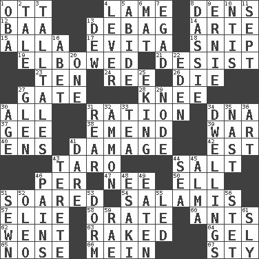 ACROSS 1. Baseball player Mel 4. Unable to walk 8. Habitations of wild animals 12. Sound made by sheep 13. Debunk (Brit. slang) 14. Johnson of "Laugh-In" 15. Silent film actress Nazimova 17. Webber/Rice musical 18. Sever or remove by pinching or nipping 19. Turned at an angle; bent 21. Stop 23. "___ Little Indians" 24. To riddle 26. Pass on 27. Yard entry 28. Leg joint 30. 100% 31. Food allowance for one day 34. Heredity factor (abbr.) 37. Unit of force equal to gravity 38. Make improvements or corrections to 39. Armed conflict 40. Followers of ems 41. Break 42. Eastern Standard Time (abbr.) 43. Edible starchy tuberous root 44. Table seasoning 46. For each 47. Born 50. Pipe bend 51. Flew 54. Deli grouping 57. Writer Wiesel 58. Declaim 60. Pismires 62. Gone 63. Moved through 64. Set 65. Sense of smell 66. Chow _ 67. Filthy place DOWN 1. Chief or king in Benin or Nigeria 2. Story 3. Baron Munchausen's specialties 4. Prying instrument 5. Tolerate 6. Floor protector 7. Mild oath 8. Hyrax 9. Bert's buddy 10. Nuclear Threat Initiatives 11. Back-to-school mo. 13. Morning condensation 16. Collude with 20. Single 22. Locale of original sin 25. Supplementing with great effort 27. Small, secluded valley 29. Connecting point 30. Ripen 31. Bring up, as a child 32. ID or VA city 33. Afternoon social gathering 34. Homes 35. Political cartoonist Thomas 36. Nonscientific branch of learning 41. Have the gumption 43. Cylindrical with tapered ends 44. Ocean 45. _ mater 46. Aches 48. 1973 Nobel Price Winner (Physics) Leo 49. Consumed 51. Stitched 52. Margarine 53. Dormintory (informal) 55. Directed 56. Proofreading order 59. Actress Charlotte 61. Stealthy