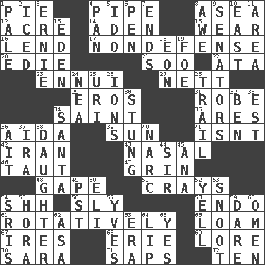 ACROSS 1. Sliced dessert 4. Corncob 8. At sea 12. 43,560 square feet 14. An important port of Yemen 15. Put on (as clothing) 16. Grant temporary use of 17. Unrelated to defense, as in spending 20. Singer Brickell 21. "Barney Miller" actor Jack 22. "One Day ___ Time" 23. World-weariness 27. Remaining after all deductions 29. Greek god of love 31. Loose flowing garment 34. Virtuous person 35. Ancient Greek god of war 36. Opera by Verdi 39. Player for Phoenix 41. Is not 42. SW Asia republic 43. Rhinal 46. Pulled tight 47. Smile widely 48. Stare wonderingly 51. Trading vessels 54. Quiet! 56. Insidious 58. Inside; within (prefix) 61. Rotating or pertaining to rotation 66. Rich soil 67. Angers 68. 4th largest of the Great Lakes 69. Old wives' tales, e.g. 70. "Two Mules for Sister ____" 71. Plant excrements 72. "___ Little Indians" DOWN 1. Light colored 2. On the rocks 3. Bert's buddy 4. Baking dish 5. Wedding promise 6. Writing instrument 7. Extremities 8. Deep reverence 9. Legislators 10. Compass direction 11. Type of rug 13. Locale of original sin 18. A really long time 19. Enemy 24. Teachers' org. 25. RI univ. 26. Charged particles 28. Hang back 30. Feeling sharp psychological pain 32. Benjamin's nick name 33. Eastern Standard Time (abbr.) 34. Before Barbara or Clara 36. Small island 37. Retirement account (abbr.) 38. Female offspring 40. Drug cop 44. Title for a knight 45. Santa ___, CA 49. Pacific Standard Time (abbr.) 50. Connecticut Ivy Leaguer 52. Shout 53. Snob 54. Indian titles of respect 55. Israeli folk dance 57. Jacques Cousteau's middle name 59. Have the gumption 60. Sign of something about to happen 62. White ___ sheet 63. Period 64. Mouth edge 65. Affirmative reply