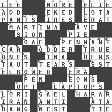 ACROSS 1. Area sheltered from the wind 4. Greater amount 8. Writer Wiesel 12. Increase 13. Made supply last 14. Globular water bottle used in Asia 15. Leg coverings 18. Angers 19. Part of Q.E.F. 20. Chrissie's court nemesis 22. "___ Maria" 23. The Jewish people; Israel 24. Sliced dessert 25. Clumsy lout 26. Pre-World Series prize 30. Auto 33. More peculiar 36. Loyal 37. Washington bills 39. _ tizzy (2 wds.) 40. Coop moms 41. Pulled tight 42. Pulls into pieces 44. Fast jet (abbr.) 45. Turned at an angle; bent 47. Period 50. Fenced enclosure 51. Immeasurably long periods of time 53. Elect 54. Portable computers 57. Australian parrot (variant) 59. Highlander 61. Ethiopian city, capital of Harari 63. SW Asia republic 64. Opposed to 65. _ moment's notice (2 wds.) 66. Mild oath, euphamism for damn 67. Egg locale 68. Standoff DOWN 1. Infant locale 2. Dutch treat 3. Ferber et al. 4. Count _ (2 wds.) 5. Gumbo ingredient 6. Portuguese money of account (variant) 7. Begley and Asner 8. Veterans Day date 9. Old wives' tales, e.g. 10. Call ___ day 11. Erode 16. Musical group of three 17. Portico 21. Information 22. The 18th letter of the Arabic alphabet 24. For each 26. Lightbulb-shaped fruit 27. Ancient Greek god of war 28. Religious women 29. Trial 30. ____ d'Azur (French Riviera) 31. Of or related to the anus 32. Reuben's nickname 34. Passed on 35. Heredity factor (abbr.) 38. Constricting 42. Nine, plus one 43. Ooze 46. Dripping 48. Writer of Portnoy's Complaint (1969) 49. Small Philippine buffalo 52. Small fatty European fish 53. NW Algerian seaport 54. Allows 55. Set down 56. Suttee (variant) 57. Hat (slang) 58. Mouth or opening 59. Separate the seeds from cotton 60. A saturated hydrocarbon 62. Actress Charlotte