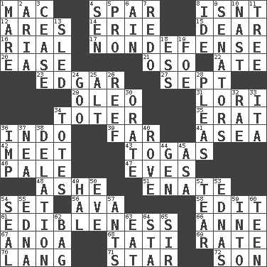 ACROSS 1. Apple computer (short form) 4. Coast Guard woman 8. Is not 12. Ancient Greek god of war 14. One of the Great Lakes 15. Letter starter 16. Monetary unit of Yemen 17. Unrelated to defense, as in spending 20. Relaxation 21. Bear (Spanish) 22. Had dinner 23. _ Allan Poe 27. Back-to-school mo. 29. Butter sub 31. Australian parrot (variant) 34. Carrier 35. Part of Q.E.F. 36. Southeast Asian peninsula 39. Distant 41. Toward the sea 42. Confront 43. Ancient Roman robes 46. Diluted with white 47. Nights before holidays 48. American tennis player Robert 51. Related on the mother's side 54. Put into a specified state 56. Actress Gardner 58. Prepare for publication 61. The property of being fit to eat 66. Queen of England 1702-14 67. Small Philippine buffalo 68. Jacques of French films 69. Pace 70. Austrian-born American filmmaker Fritz 71. Play the lead 72. Male offspring DOWN 1. Female horse 2. Roberta Peters solo 3. Desist 4. Elected rep. 5. Adept person 6. The 18th letter of the Arabic alphabet 7. Make new 8. Binary compound 9. Elected representatives 10. Political cartoonist Thomas 11. Woody plant 13. Downhill vehicle 18. Curvy letter 19. Enemy 24. Thick or sticky substance 25. Keyboard modifier key 26. Coral ridge 28. Entreaties 30. Speak pompously 32. Actress Charlotte 33. Call ___ day 34. Hauls 36. Naughty child 37. Teachers' org. 38. Accusation by an informer 40. Be footloose 44. Commissioned military rank (abbr.) 45. White ___ sheet 49. Actor Linden 50. First lady 52. Rend 53. Ferber et al. 54. Lick closed 55. Pulitzer Prize-winning author Ferber 57. Pismires 59. To the inside or interior of 60. Adolescent 62. Paper or plastic container 63. Erode 64. R.R. building 65. Title for a knight