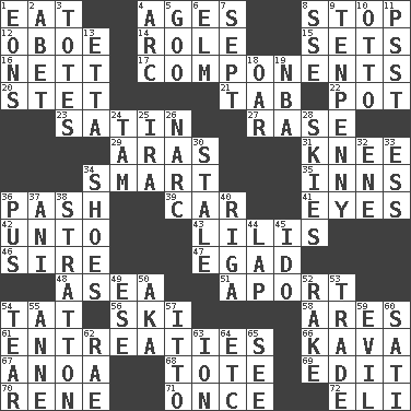 ACROSS 1. Erode 4. Grows older 8. Constrict 12. Mitch Miller's instrument 14. Hero or heavy, e.g. 15. Arranges properly for use 16. Remaining after all deductions 17. Parts 20. Proofreading order 21. Bar bill 22. Cooking vessel 23. Smooth fabric 27. To erase 29. Ancient river in northeast Turkey 31. Leg joint 34. Don Adams' spy role 35. Taverns 36. Romantic infatuation 39. Auto 41. Sight organs 42. To (old English) 43. Ms. Damita and namesakes 46. Male parent of an animal 47. Mild oath 48. Toward the sea 51. To the left, to Queeg 54. Make lace 56. What Jean-Claude Killy likes to do 58. Ancient Greek god of war 61. Pleas 66. Polynesian shrub of the pepper family 67. Small Philippine buffalo 68. Lug 69. Prepare for publication 70. French philosopher Descartes 71. At one time in the past 72. Biblical high priest DOWN 1. Immeasurably long periods of time 2. Collude with 3. Hauls 4. Curve 5. Thick or sticky substance 6. Shade tree 7. Back-to-school mo. 8. Compass dir. 9. 3-inch nail 10. "Beetle Bailey" pooch 11. Inconspicuous attention getter 13. Singer James 18. Boat paddle 19. Basketball assoc. 24. Scottish cap 25. Lyricist Gershwin 26. Drug cop 28. Atmospheres 30. Showing deterioration from age 32. Compass dir. 33. Curvy letter 34. Imelda's hoard 36. Tenth month of the Hindu calendar 37. Black tropical American cuckoo 38. Ski resort town in Vermont 40. Capital of Latvia 44. Infant locale 45. Wedding promise 49. Compass dir. 50. Alias (abbr.) 52. Libertine 53. Swap 54. Separate forcefully 55. Singer Murray 57. "Tell ____ the Marines!" 59. Morally bad or wrong 60. Suttee (variant) 62. Actress Charlotte 63. Electrically charged atom 64. And so on (abbr.) 65. Perceive with the eye
